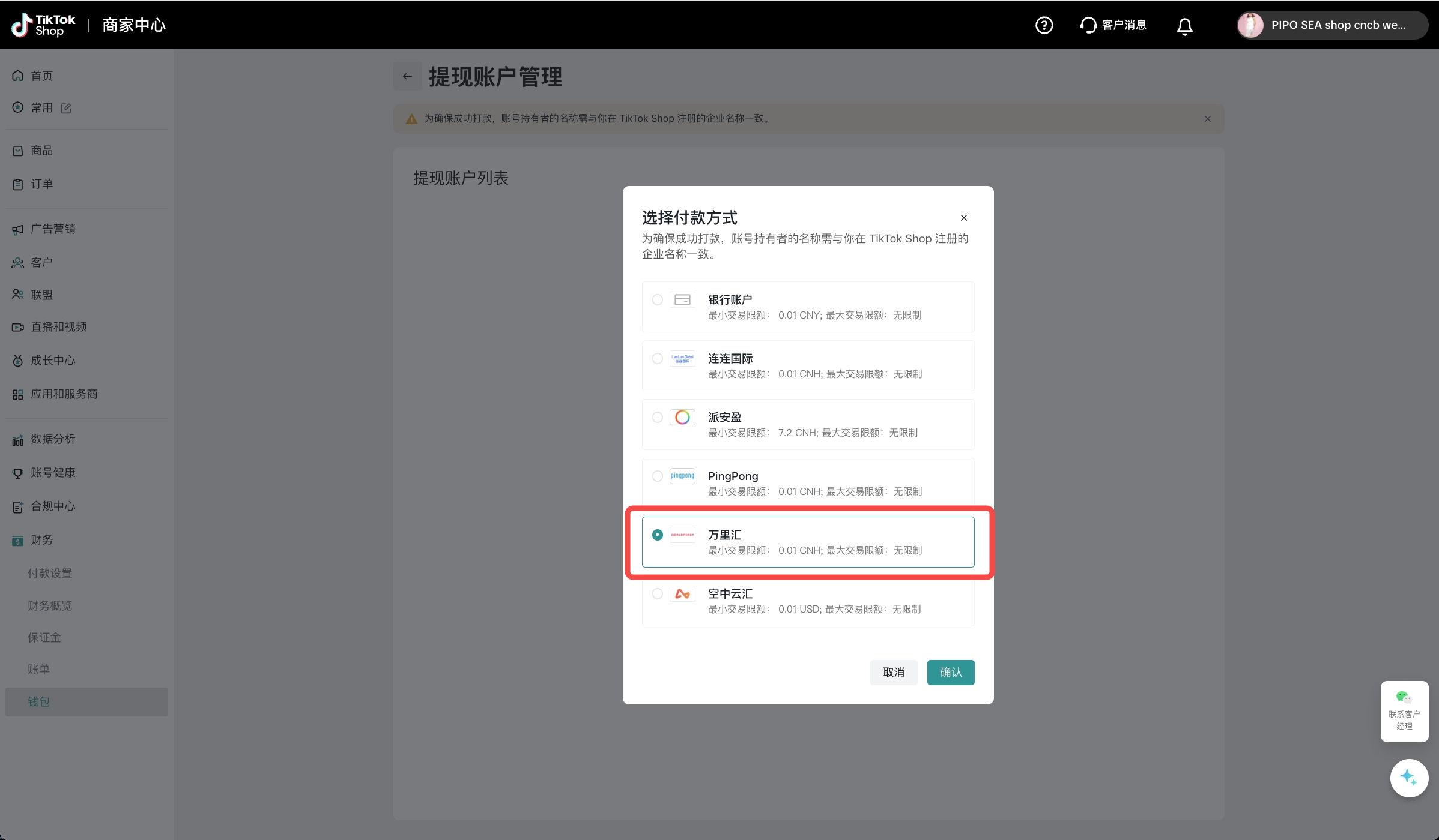 为确保成功打款,您需要选择与您在万里汇注册的企业名称一致的万里汇账户进行绑定;若您无万里汇账号,您需要在万里汇注册填写相关信息,并完成实名认证