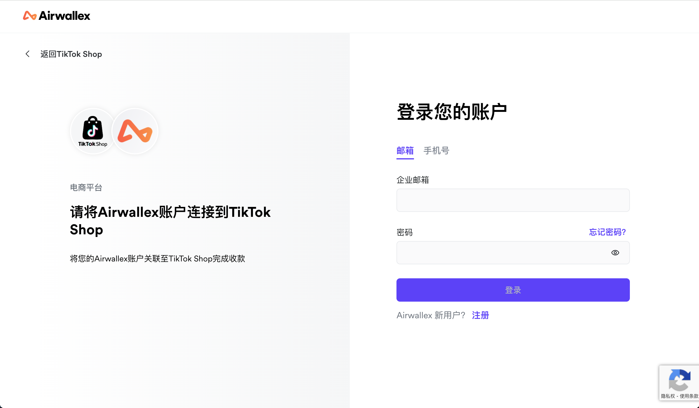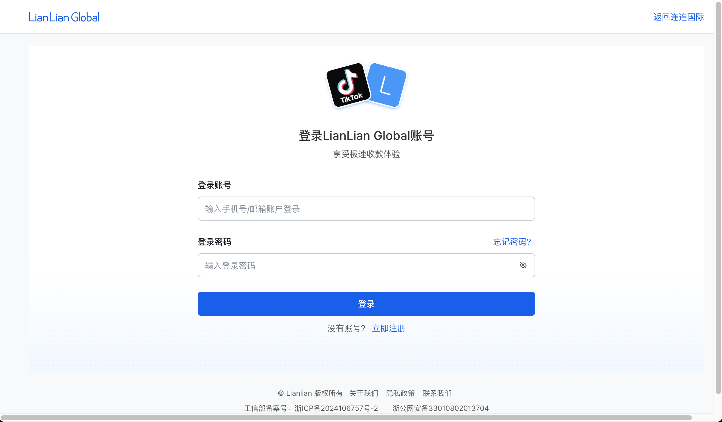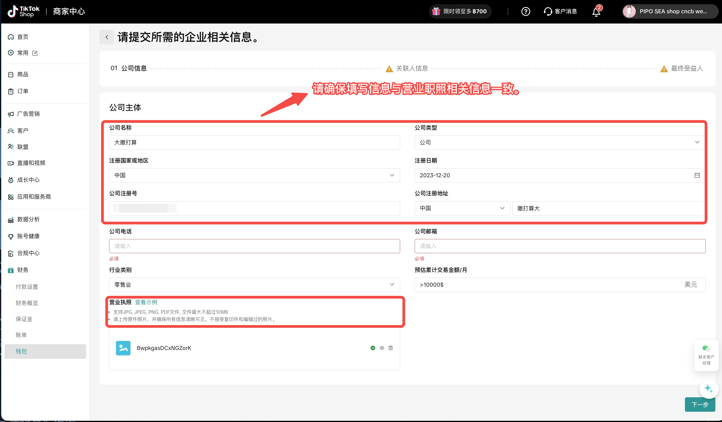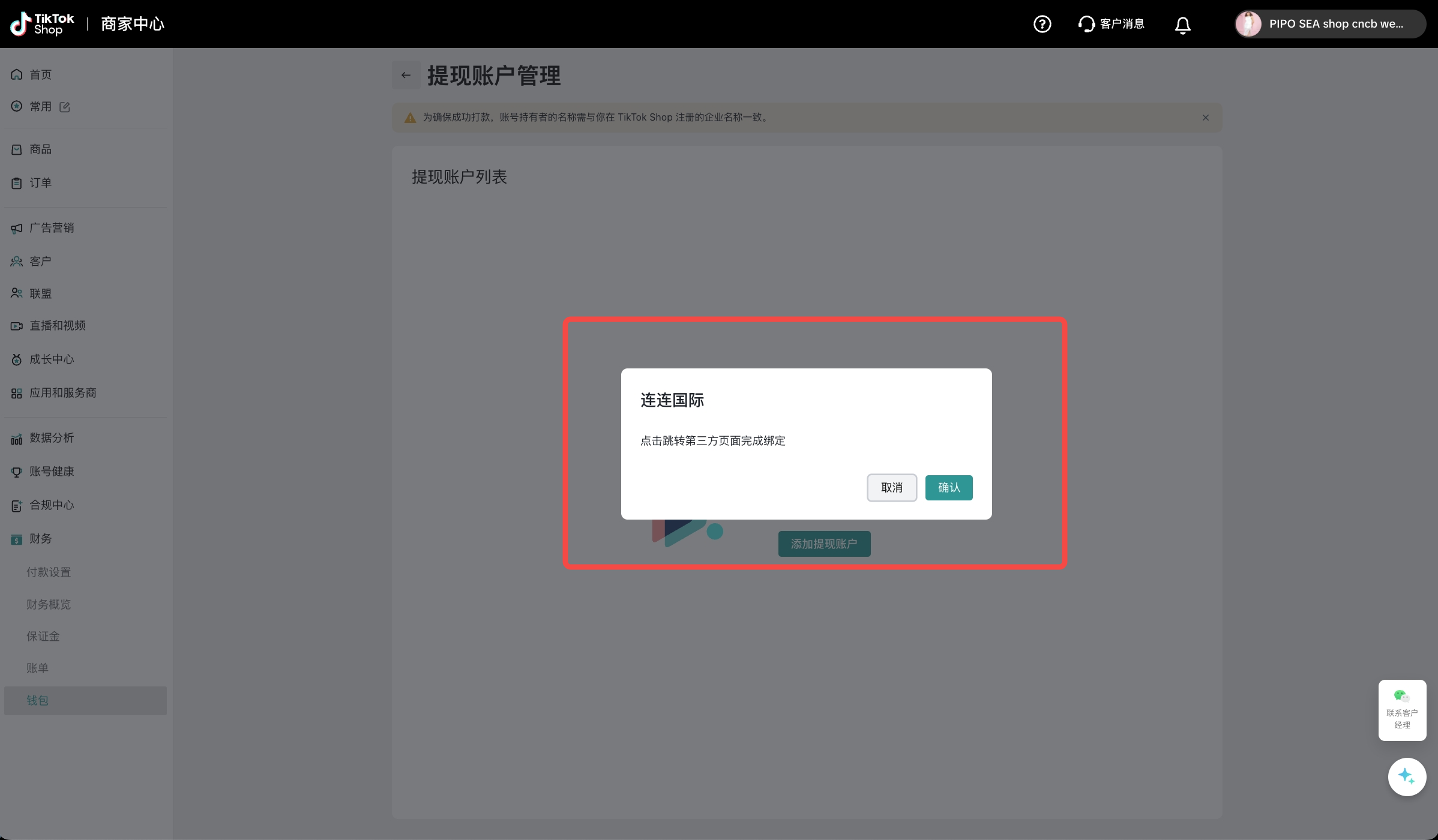 为确保成功打款,您需要选择与您在TikTok Shop注册的企业名称一致的连连国际账户进行绑定;若您无连连国际账号,您需要在连连平台注册填写相关信息,并完成实名认证