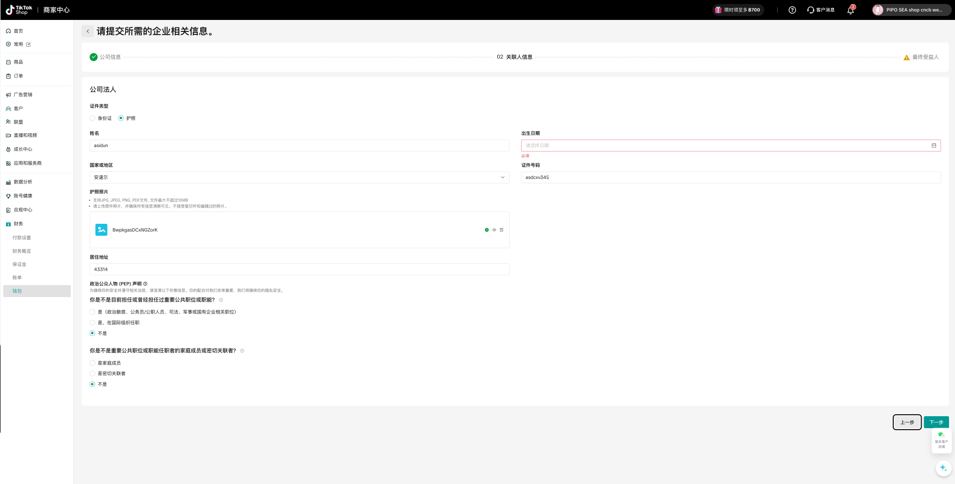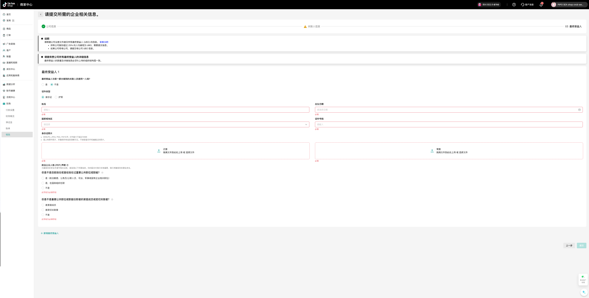 在所需的公司信息全部填写后,点击右下角的“下一步”,进入“关联人信息”补充界面。完成所需信息的填写和上传后,继续点击“下一步”,进入“最终受益人”界面。