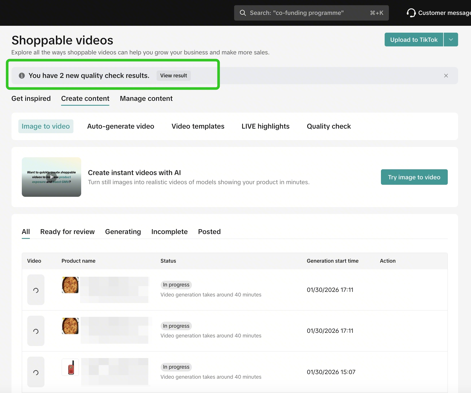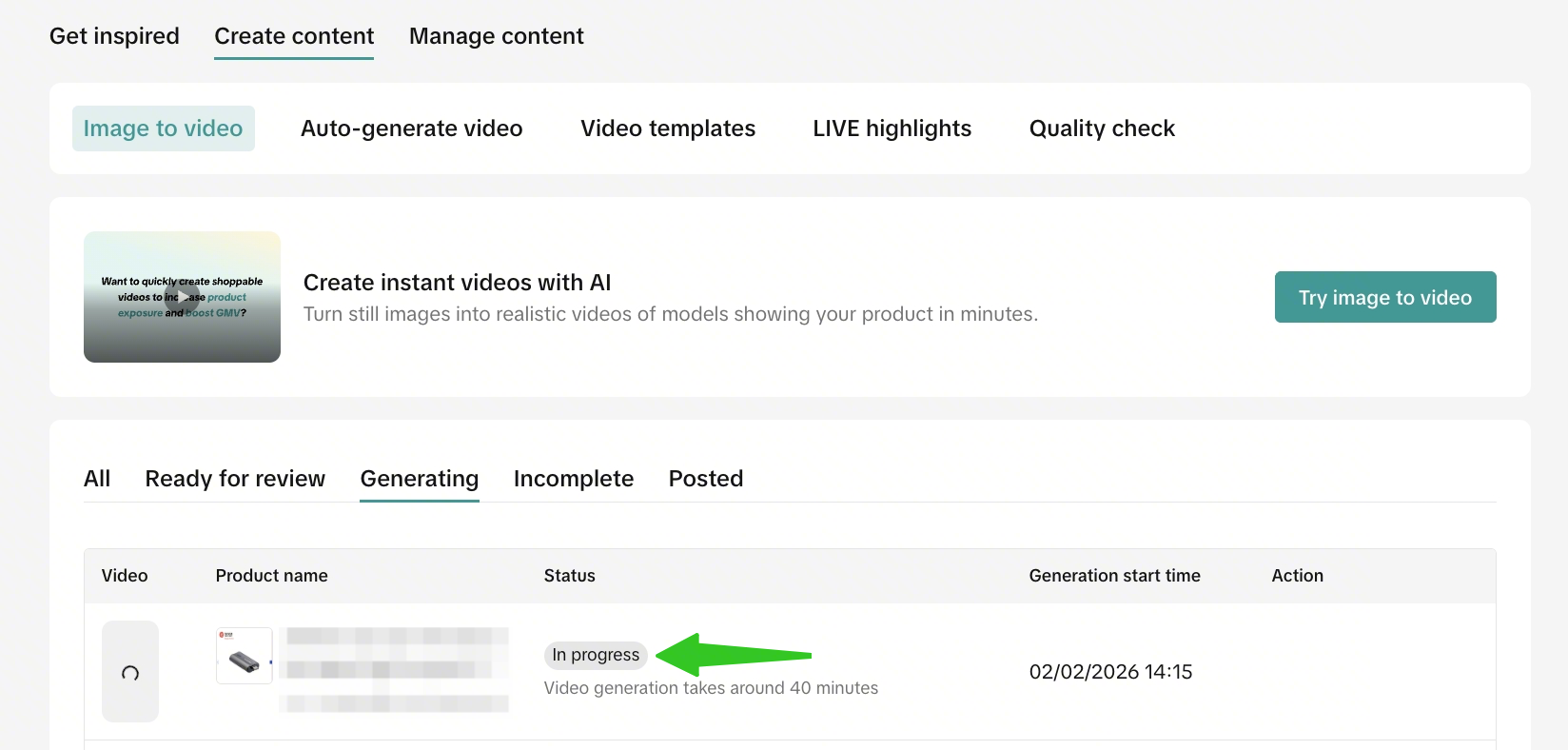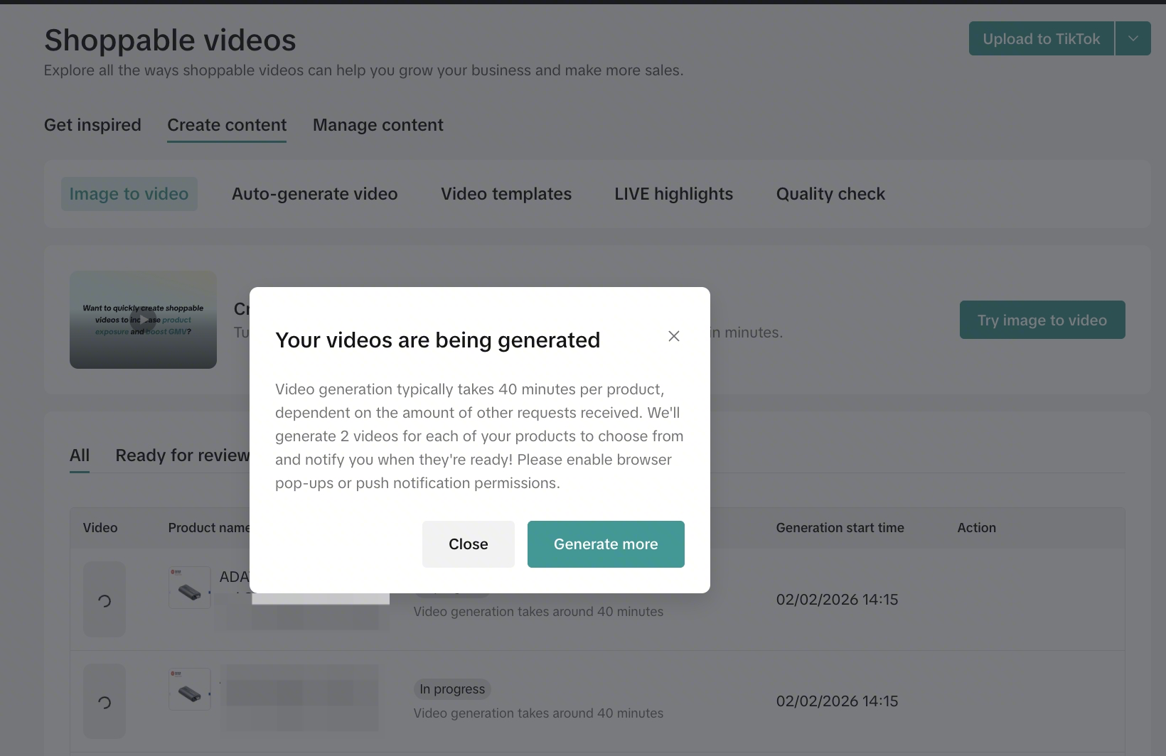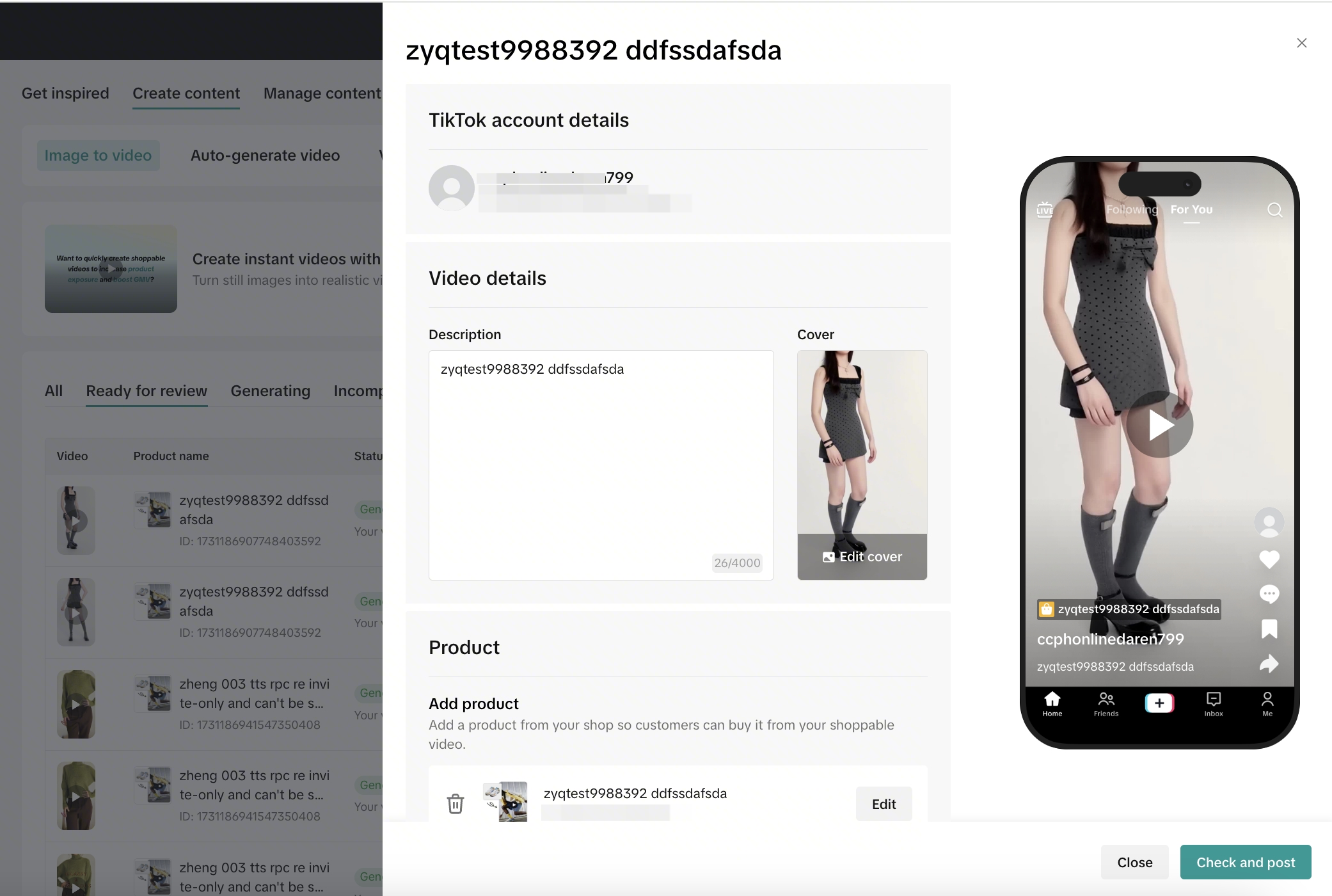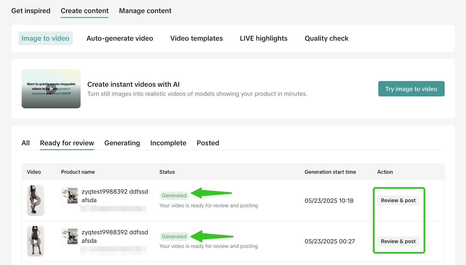 | – 在“待审核”标签页查看生成的视频。 – 点击“审核并发布”,可预览视频、更新视频描述及设置。 – 直接发布为可购物视频! | |
