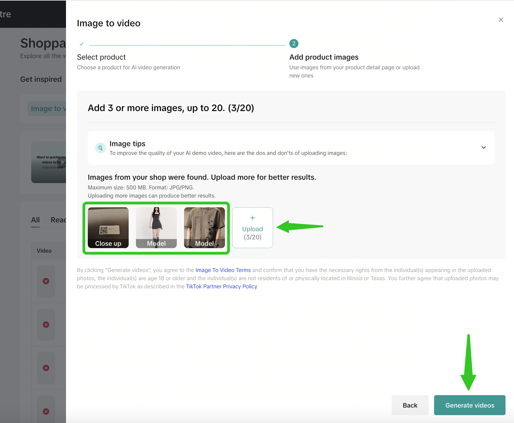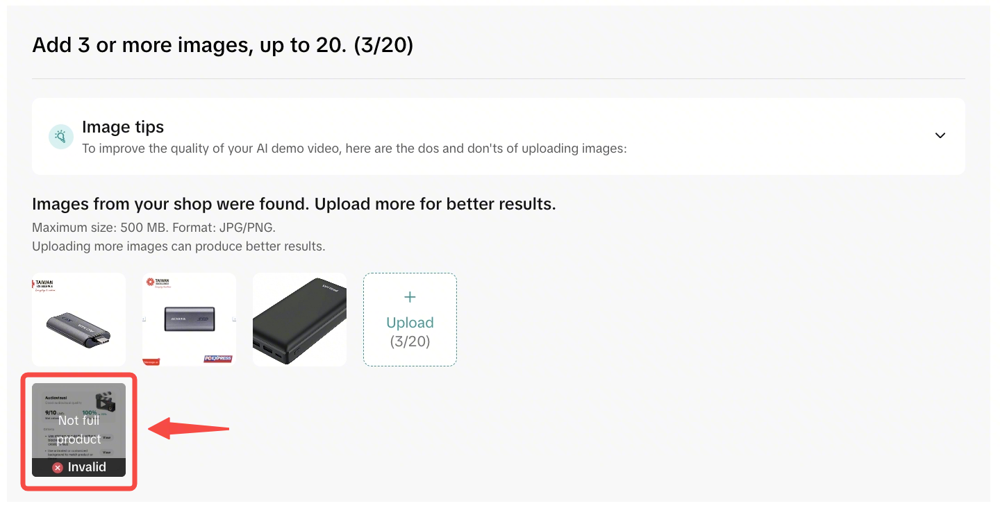 ![]() ![]() ![]() ![]() | 商家需上传至少3张有效图片,图片越多,生成效果越好。 可通过以下方式添加图片: – 使用现有商品页面的图片; – 工具会自动筛选可用图片,隐藏或标记不符合要求的图片。 – 手动上传图片(最多20张) – 上传失败的图片会被标记为“无效”,建议更换其他图片重试。 |