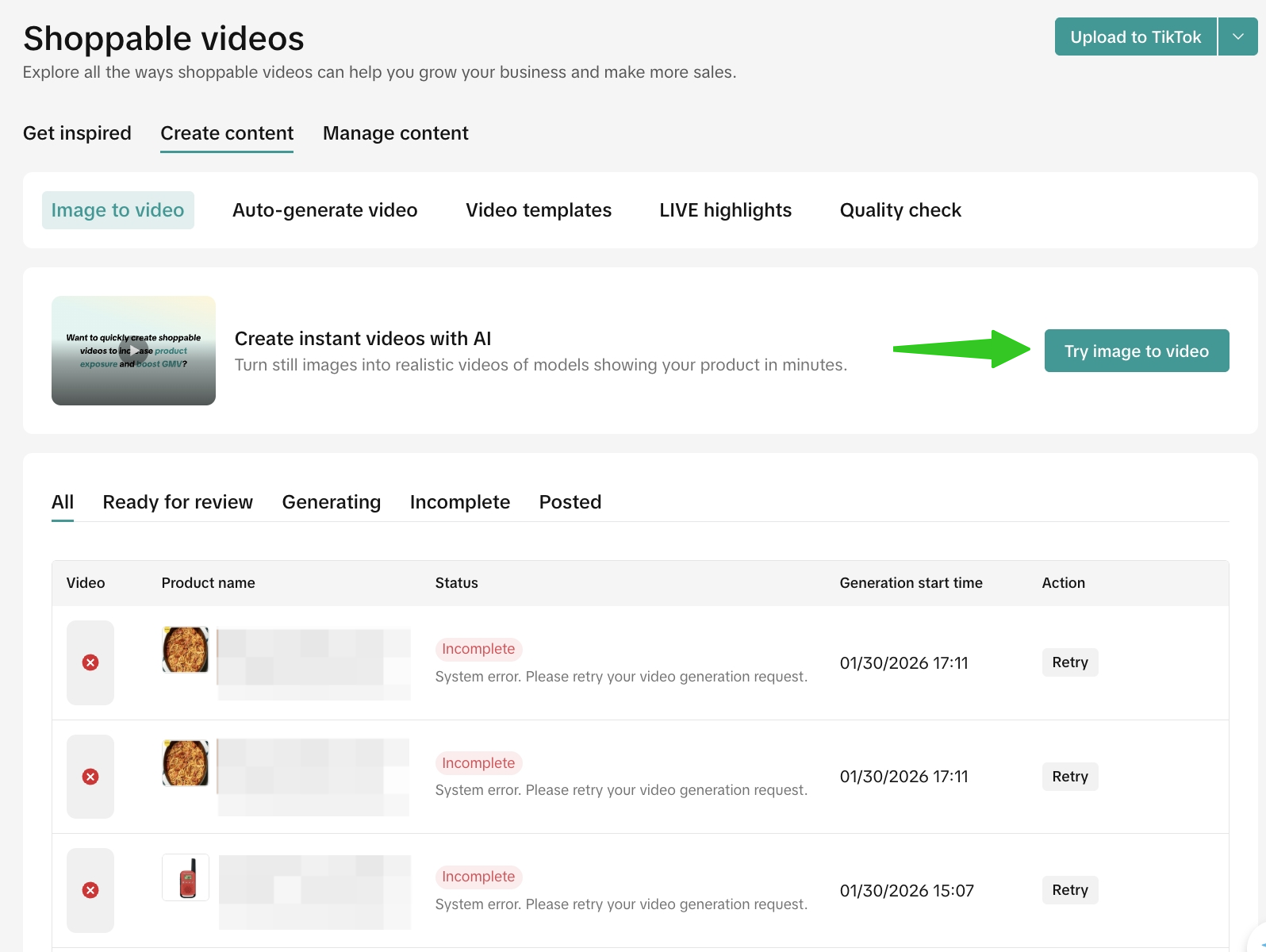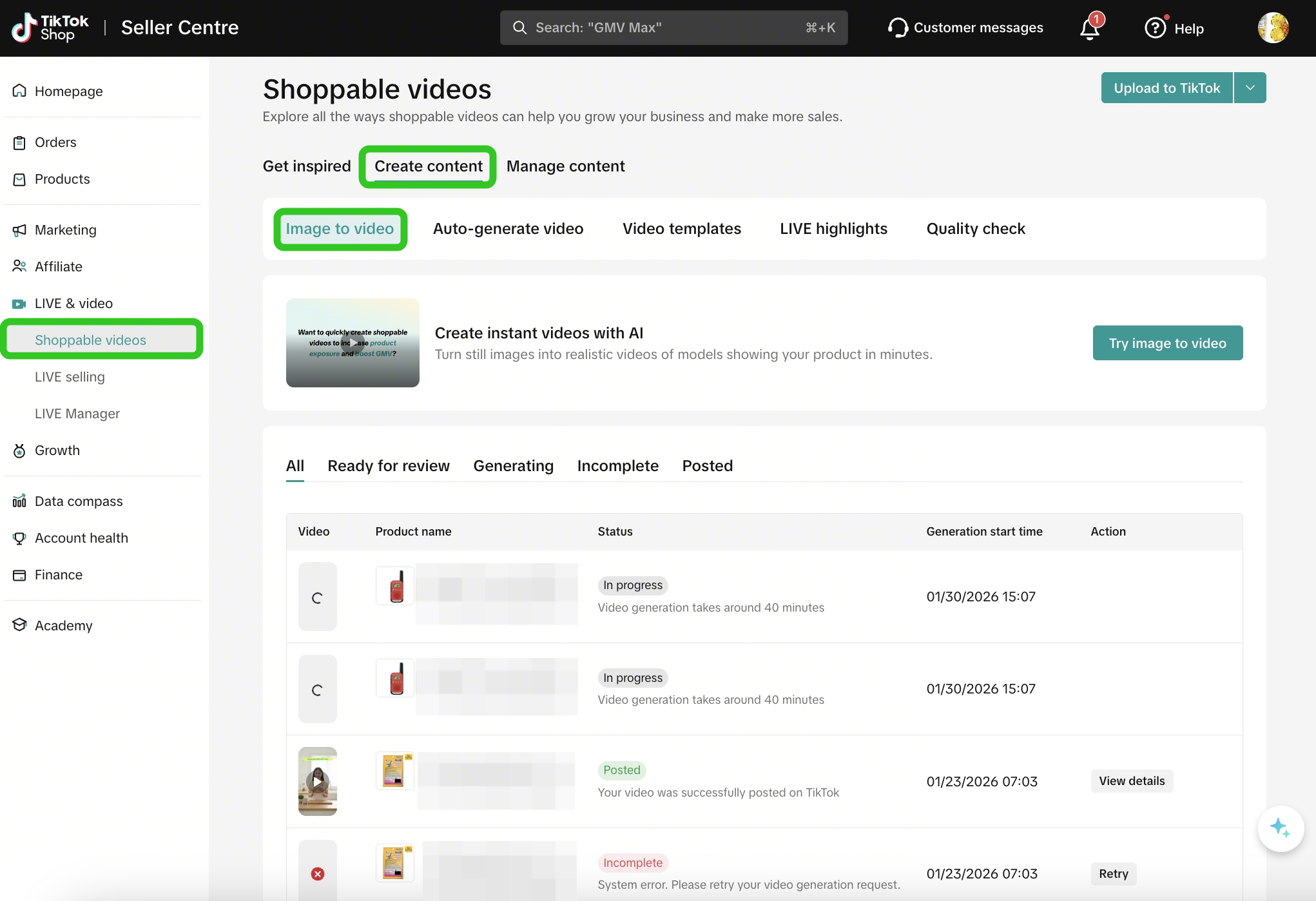 入口:商家中心 > 直播与视频 > 可购物视频 > 创作内容 > 图片转视频
