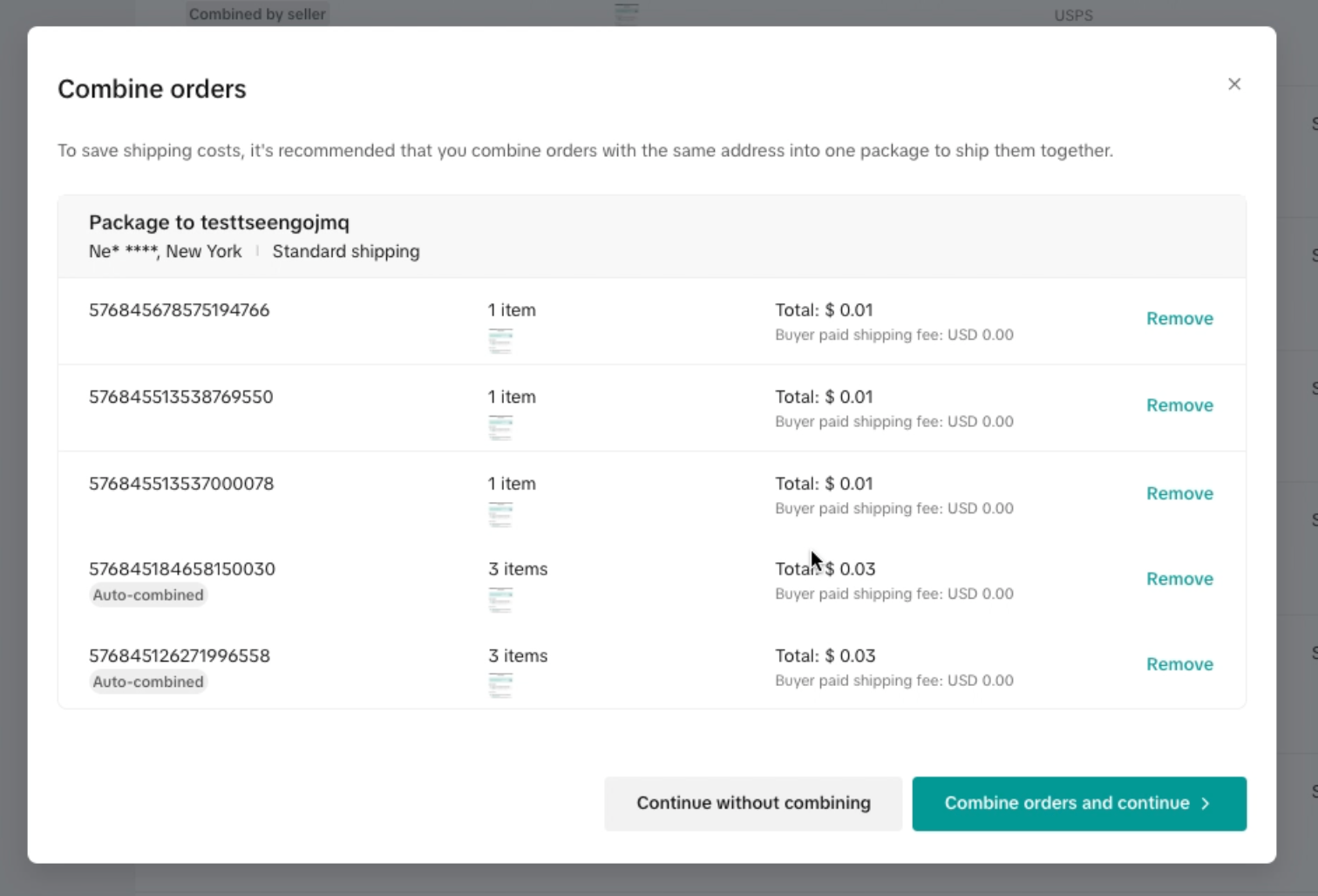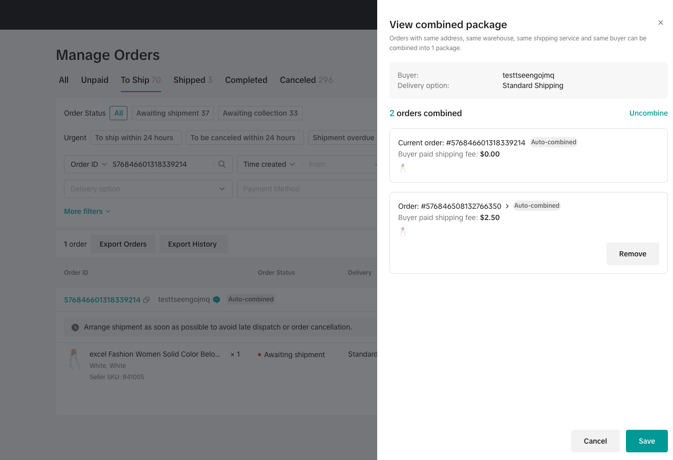 商家可以点击查看合并的包裹,移除某些订单,然后点击保存。