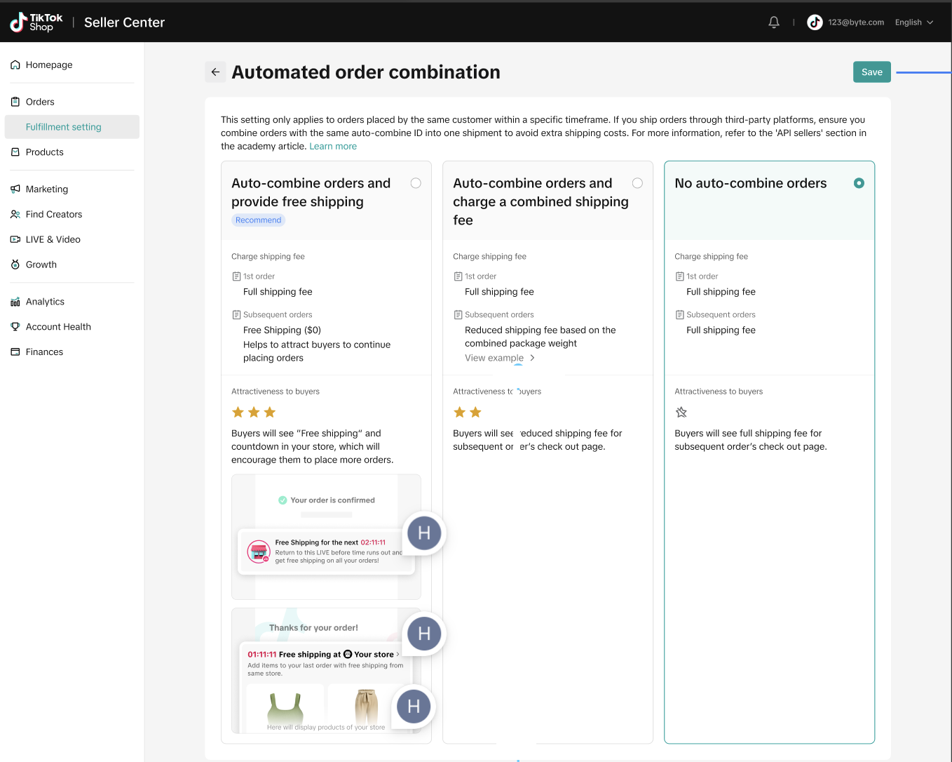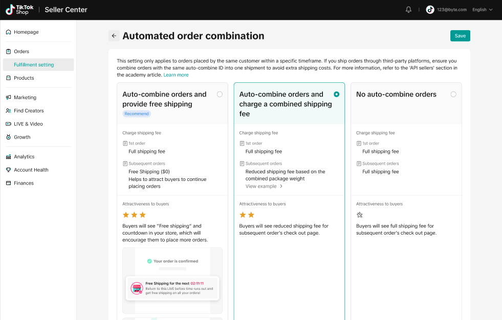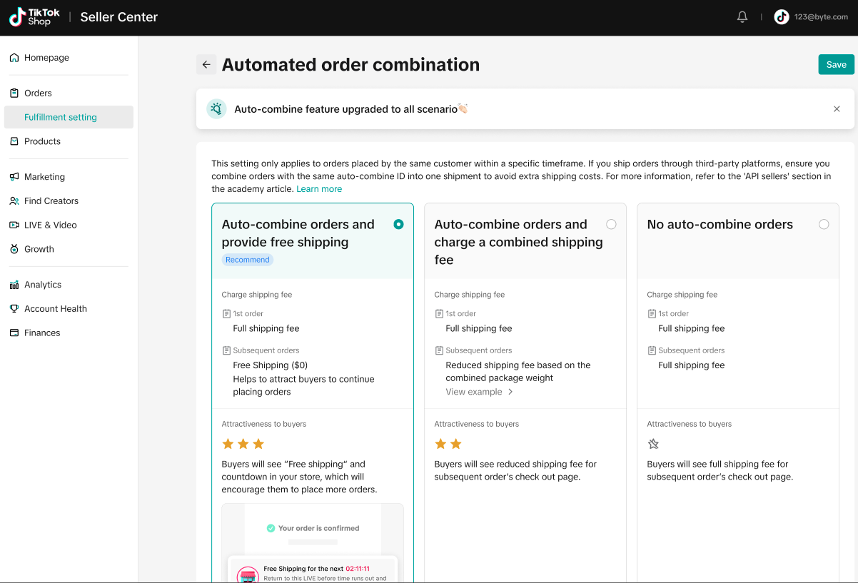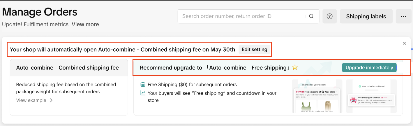 现有TikTok物流商家中心商家 – 将自动开通自动合并全渠道订单功能,并收取合并运费选项,同时推荐开通免邮选项。