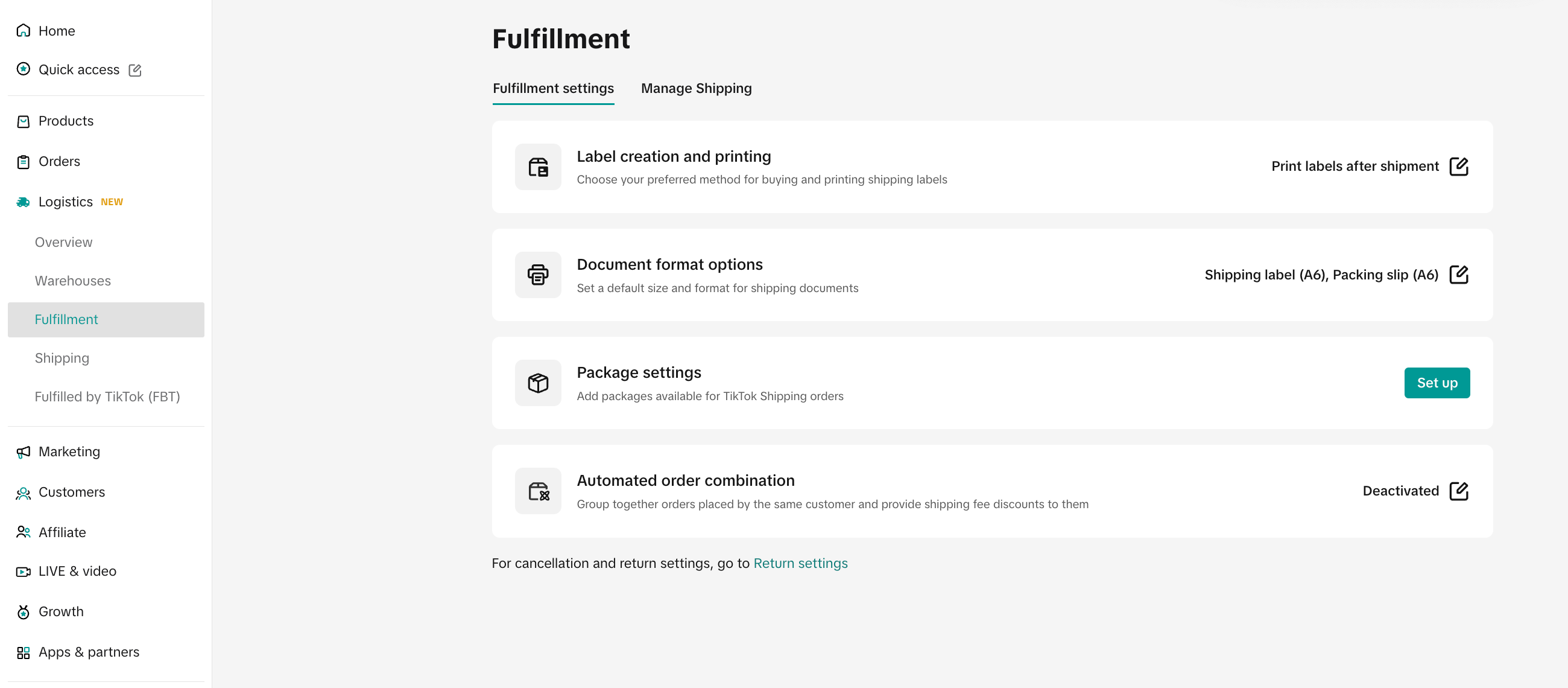 采用TikTok Shipping物流的商家可以启用此功能,查看“管理订单”中的自动合并订单,查看已合并包裹详情,取消合并或重新合并包裹,还能查看买家和打印物流面单。