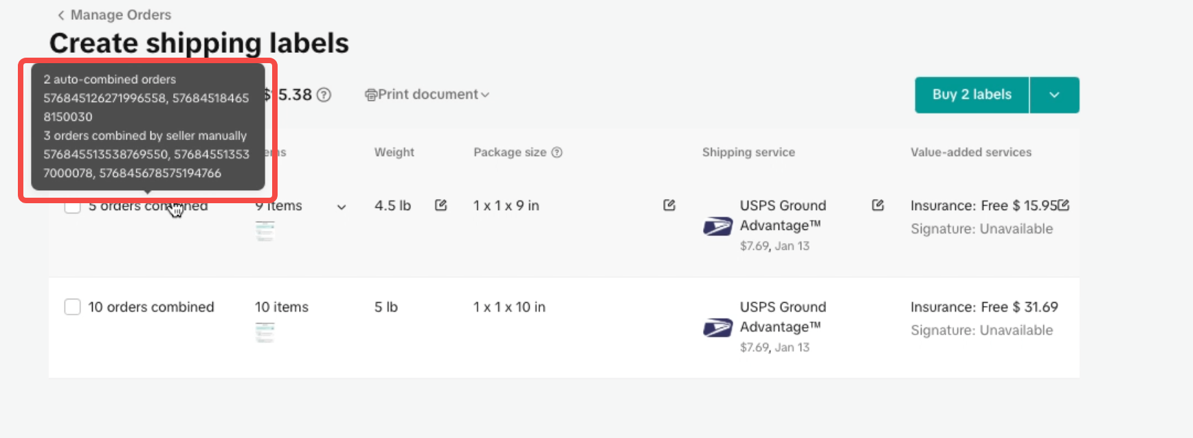 跨境直邮商家可以启用此功能,查看“管理订单”中的自动合并订单,查看已合并包裹详情,取消合并或重新合并包裹,以及确认发货。