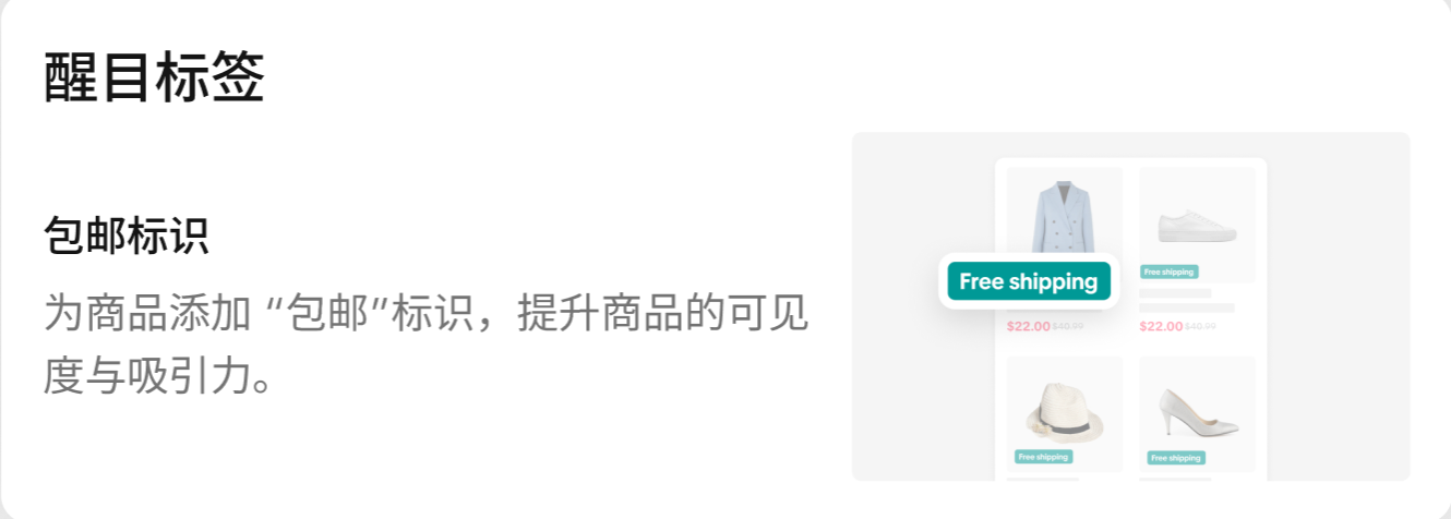 | 专属频道 | 要求:无门槛包邮 | 商品专属包邮标识 通过展示包邮标识突出商品优势,向买家传递 “包邮带来的额外价值与便捷性”,增强商品吸引力。 | ![]() ![]() |