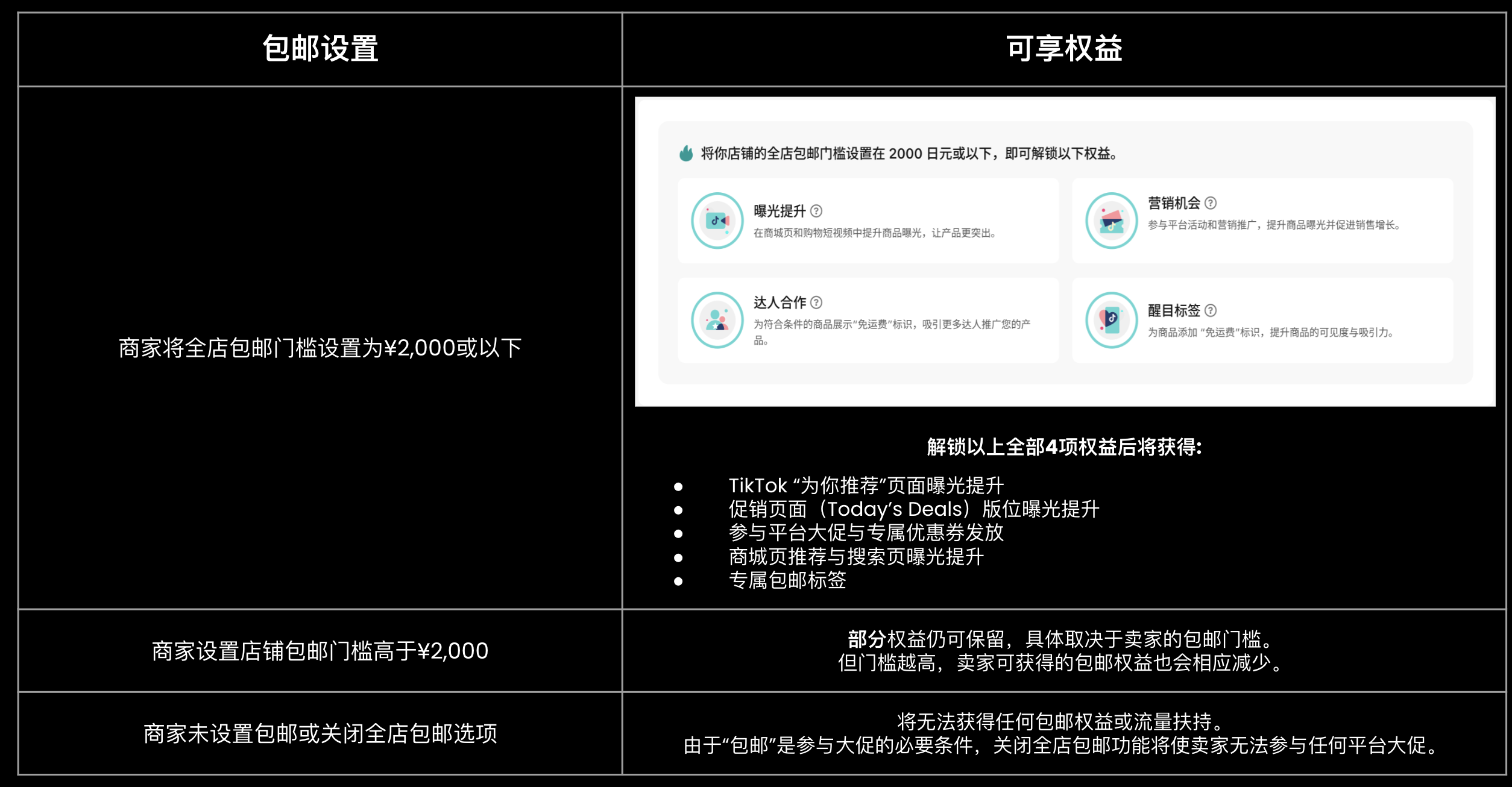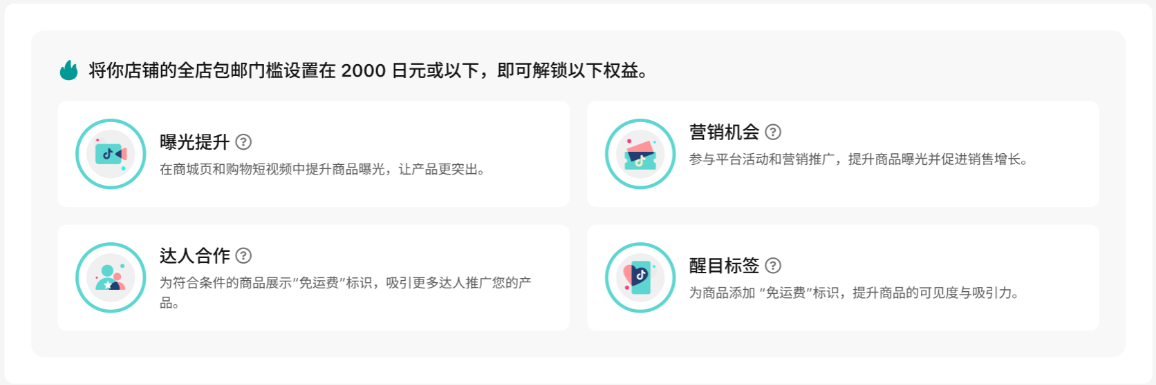 建议:自 2025 年 12 月 2 日起,建议您设置一定门槛的店铺级包邮以获取权益。权益获取情况与门槛相关,门槛越低,可享受的权益越多。