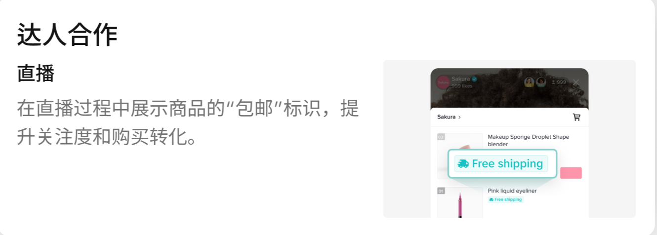 | 达人合作 | 要求:无门槛包邮 | 直播专属包邮标识 直播过程中展示商品专属包邮标识,助力您的商品在直播场景中更易被关注。 | ![]() ![]() |