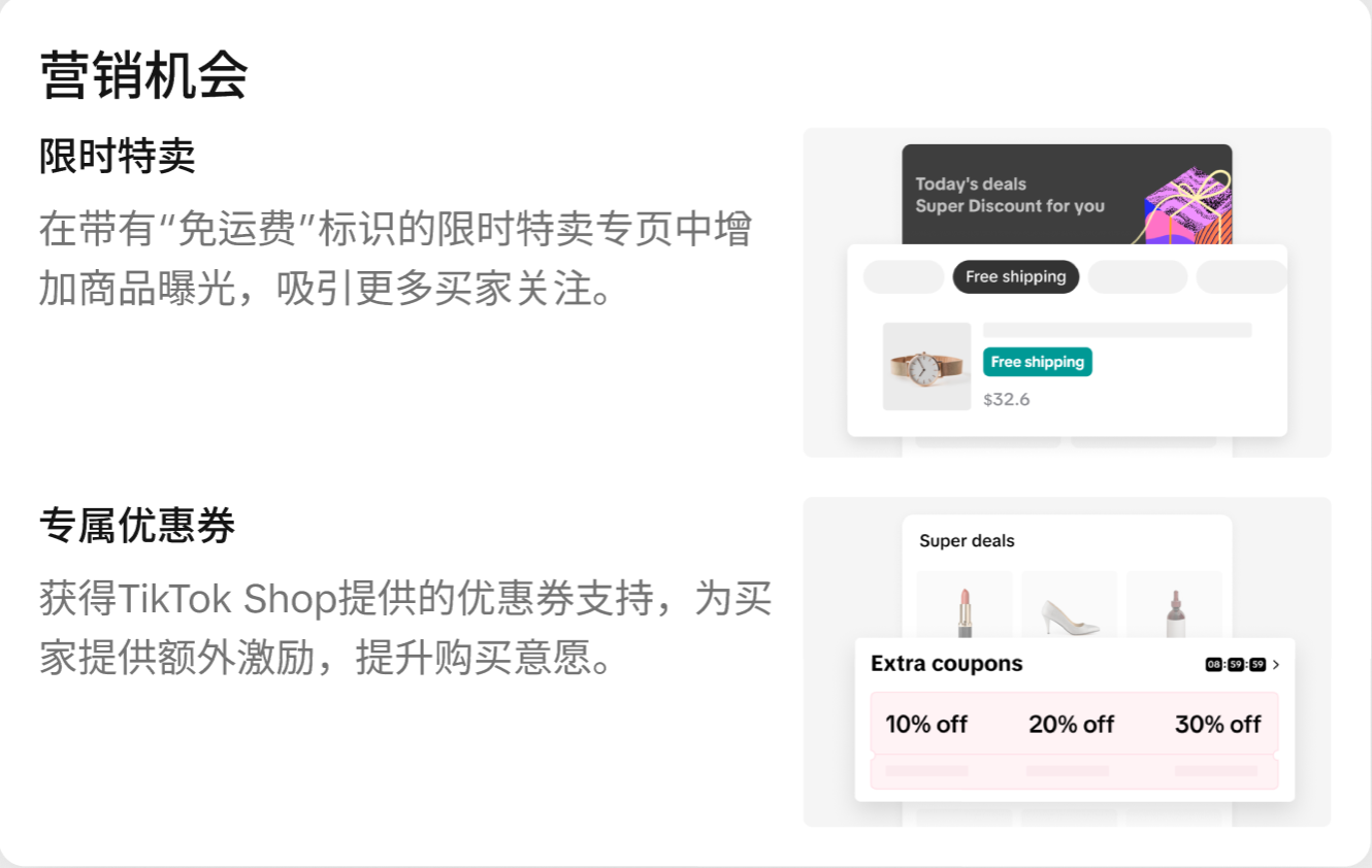 获得TikTok Shop提供的优惠券支持,为买家提供额外福利激励,吸引其优先选择您的商品。