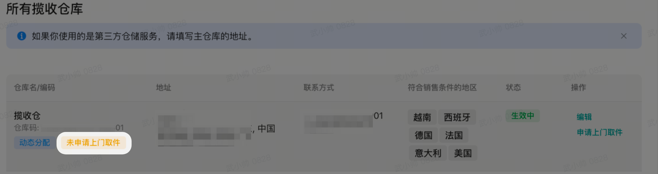 商家每次编辑完仓库信息后,对应的仓库名下方会更新显示为“未申请上门取件”状态(即上门揽收状态不生效),商家如需要申请揽收需要通过点击操作标签下展示的“申请上门取件”按钮申请;