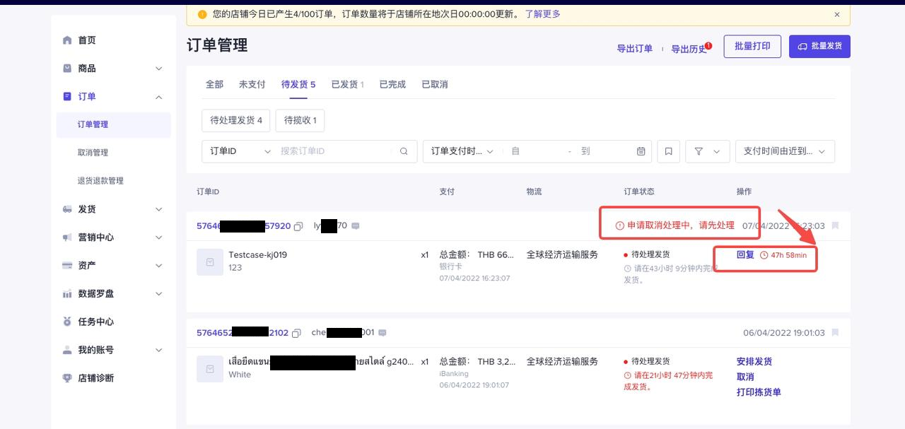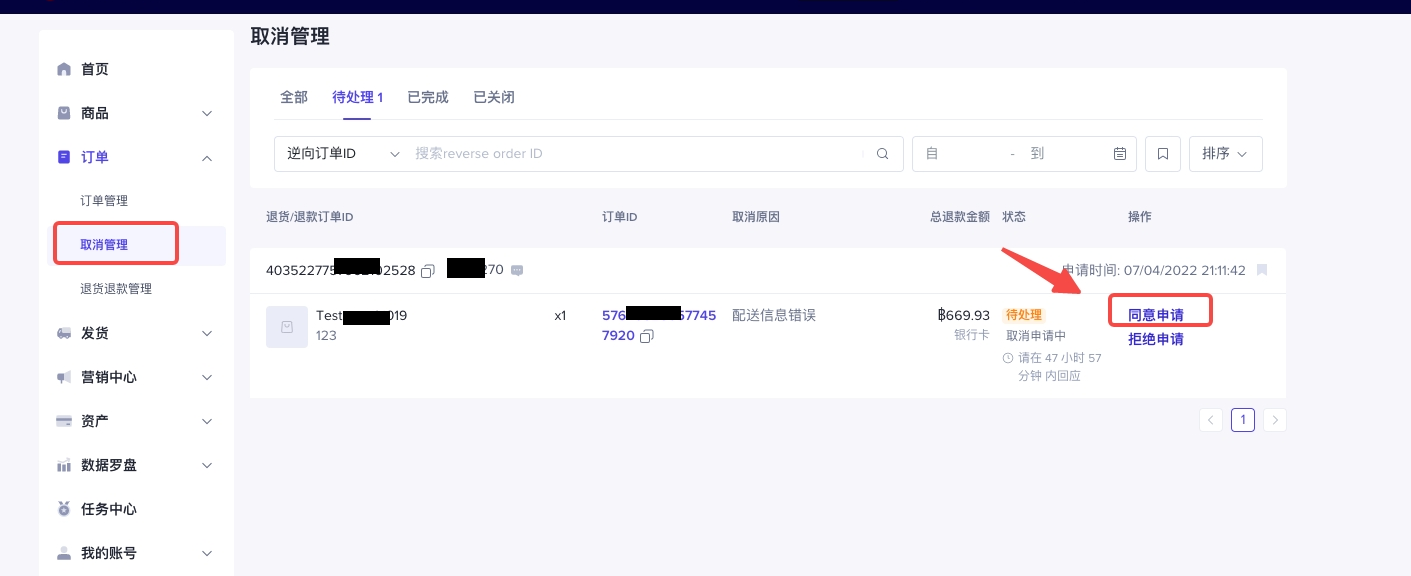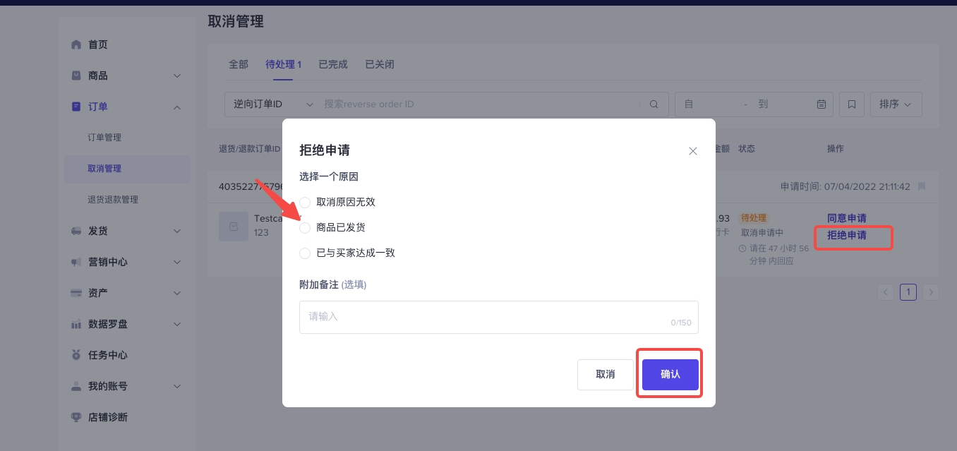 用户发起的取消,商家在“订单管理”待发货页面可以进行查看和处理,或者在取消订单页面进行查看和处理。