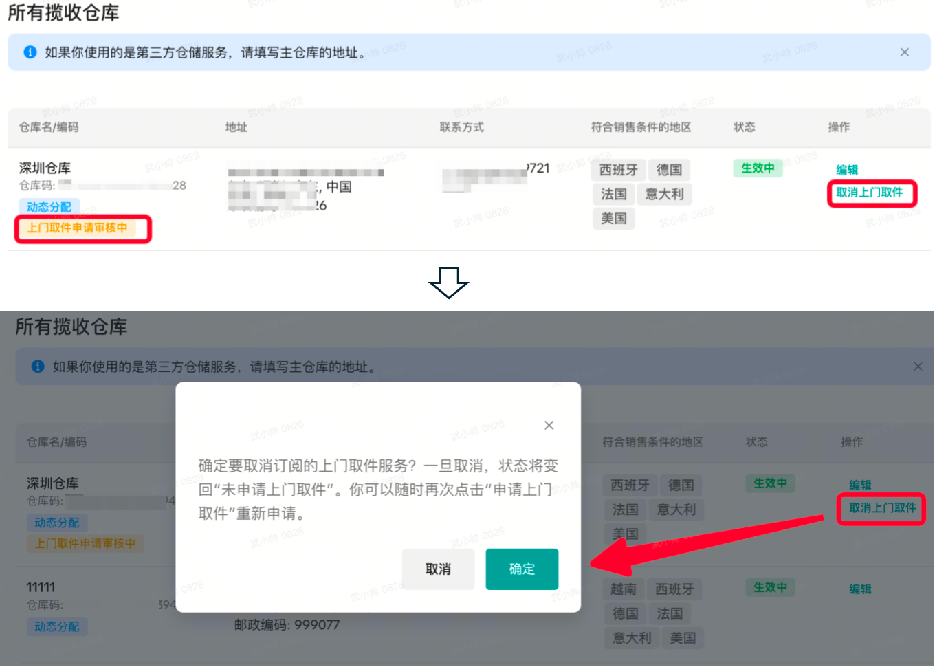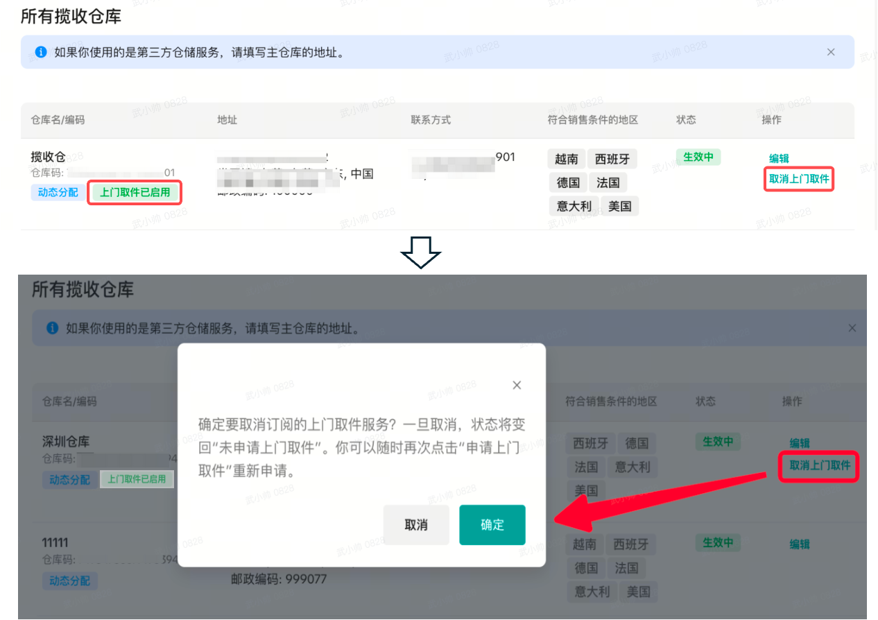 商家可在“上门取件申请审核中”、“上门取件已启用”两种状态下随时申请取消上门取件服务