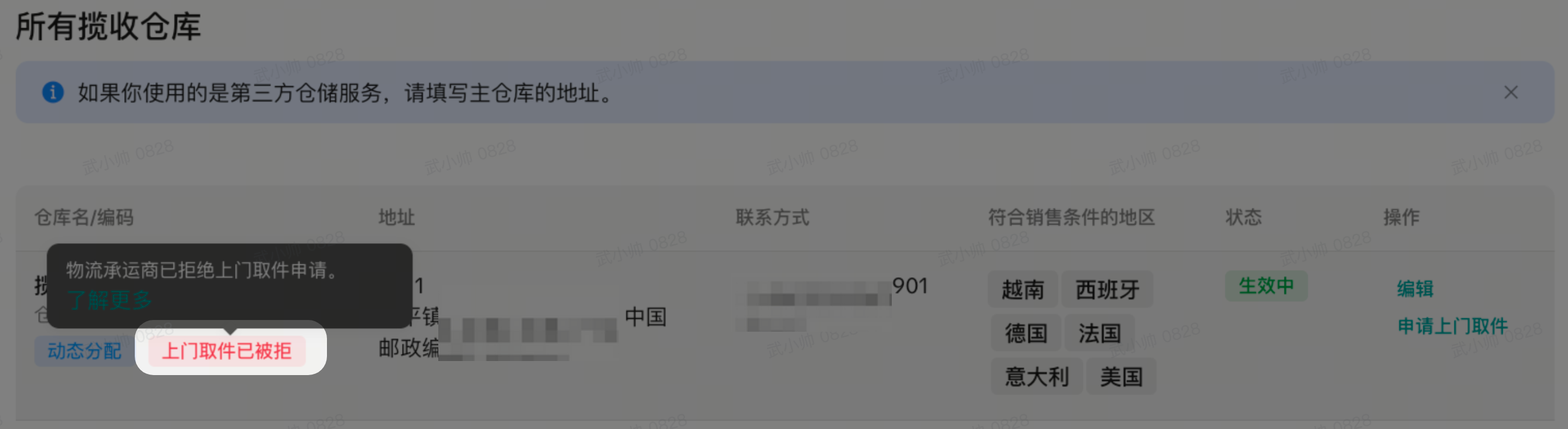 - 上门取件已被拒:如商家维护的仓库发货地址不详、实际发货地址与后台维护的发货仓库地址不一致、发货人联系方式有误、联系不上发货人等情况,都有可能导致无法审核通过上门揽收,请确保信息准确;