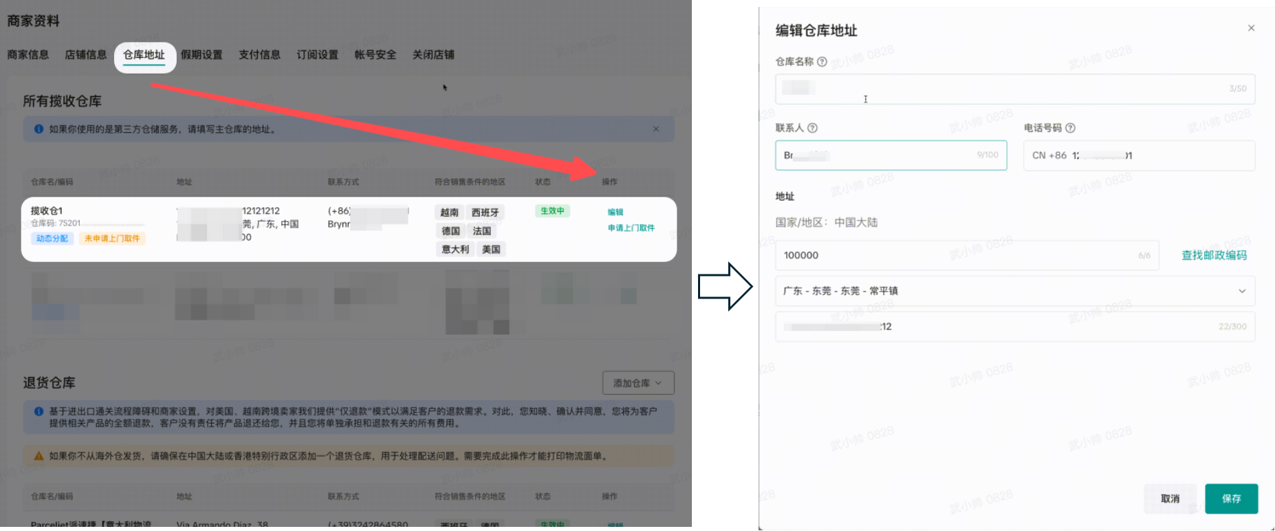 新建/编辑仓库发货地址信息: