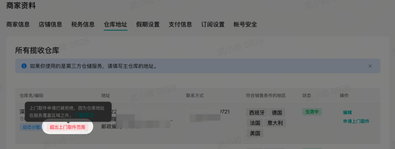 - 揽收申请通过:如揽收申请审核通过后,对应的仓库名称下方会显示“上门取件已启用”,服务商后续会联系商家沟通揽收细节