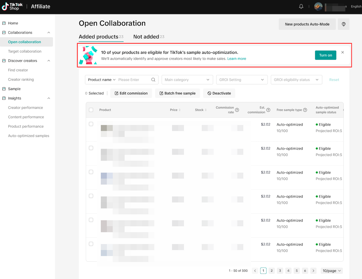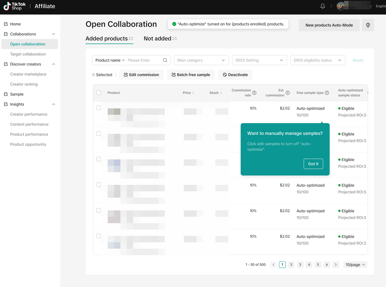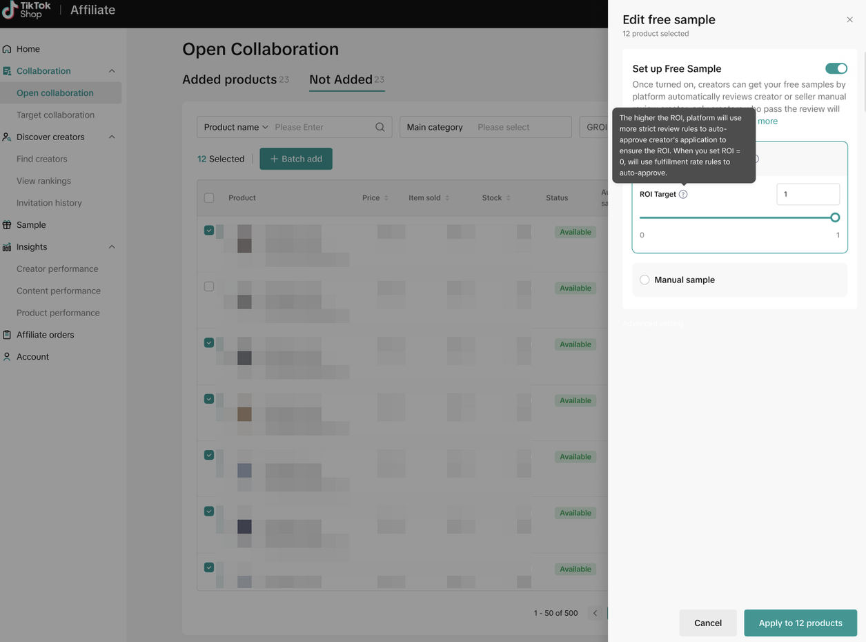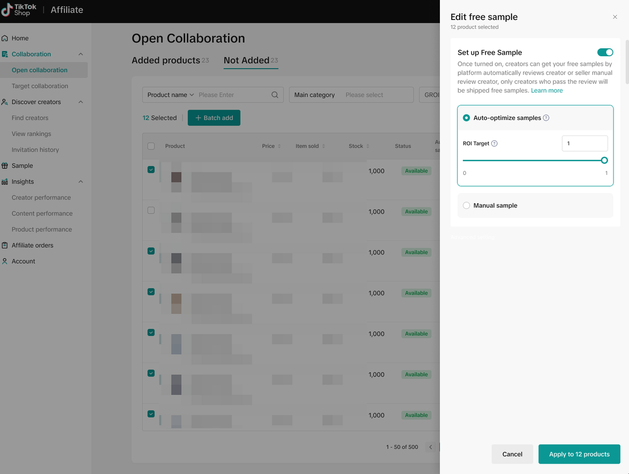 作为卖家,当你将符合条件的商品打开自动优化样品功能时,TikTok Shop将自动处理库存管理、达人匹配、样品请求审批,并提供最低目标订单量。你还可以调整已打开的商品的目标投资回报率(ROI),以通过降低ROI目标值来优化更多内容产出。