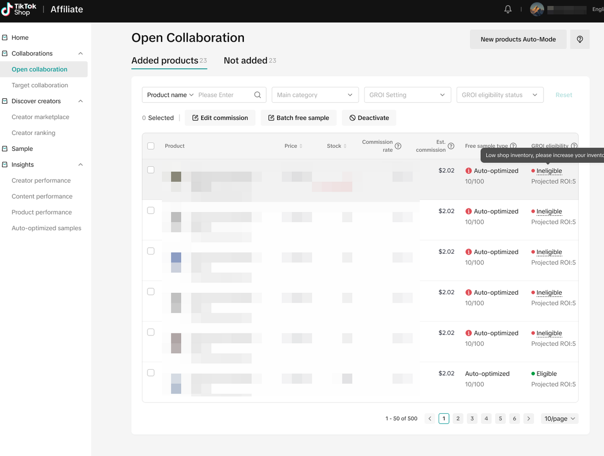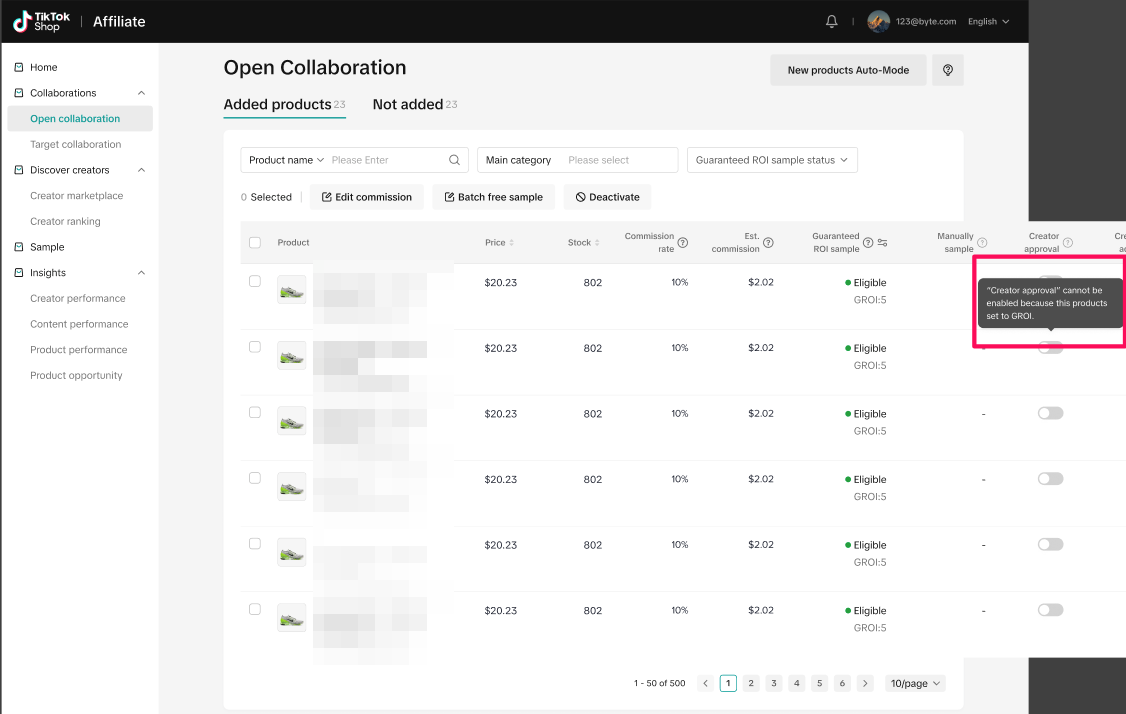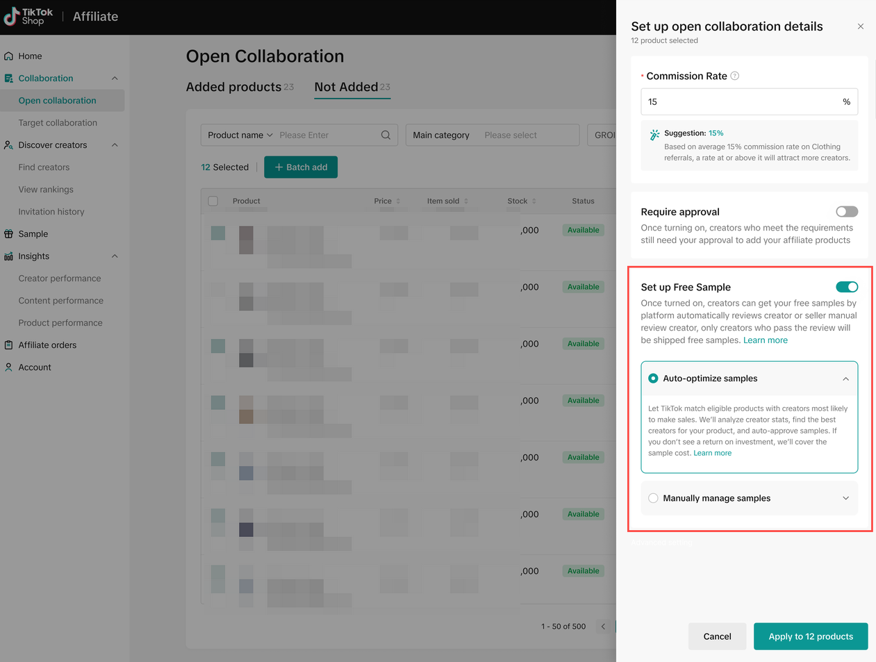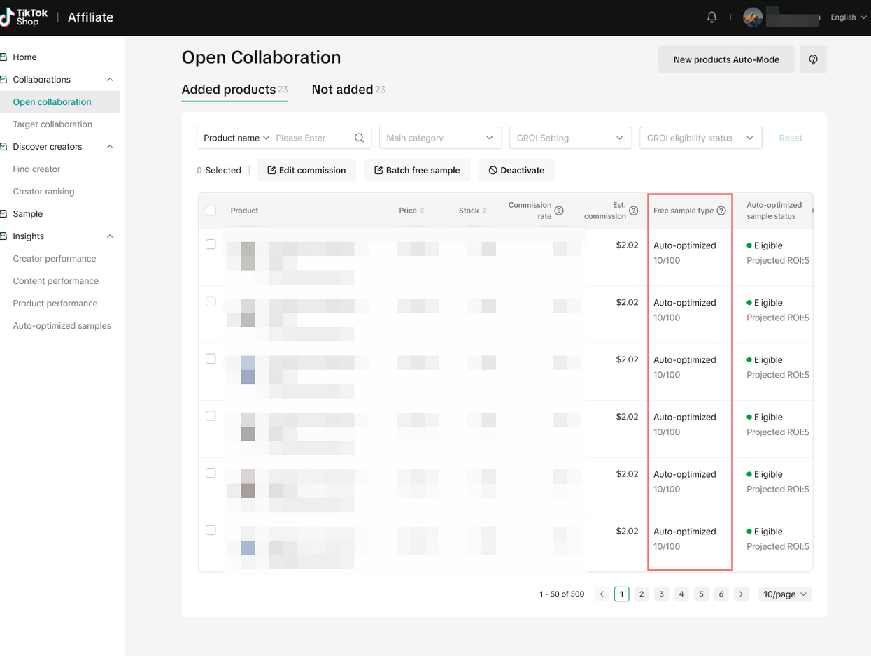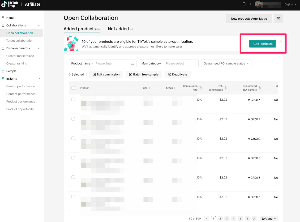 作为卖家,当你将符合条件的商品打开自动优化样品功能时,TikTok Shop将自动处理库存管理、达人匹配、样品请求审批,并提供最低目标订单量。你还可以调整已打开的商品的目标投资回报率(ROI),以通过降低ROI目标值来优化更多内容产出。