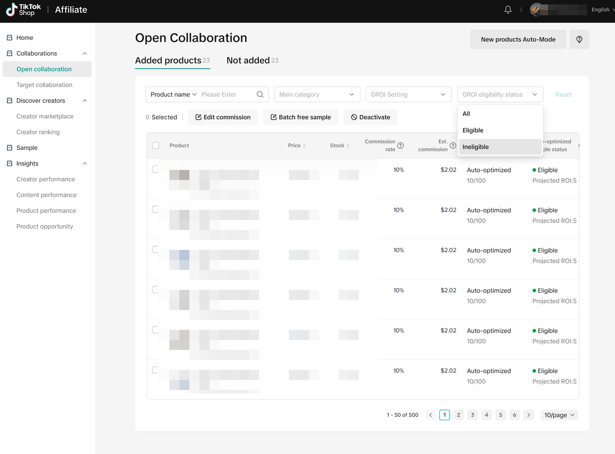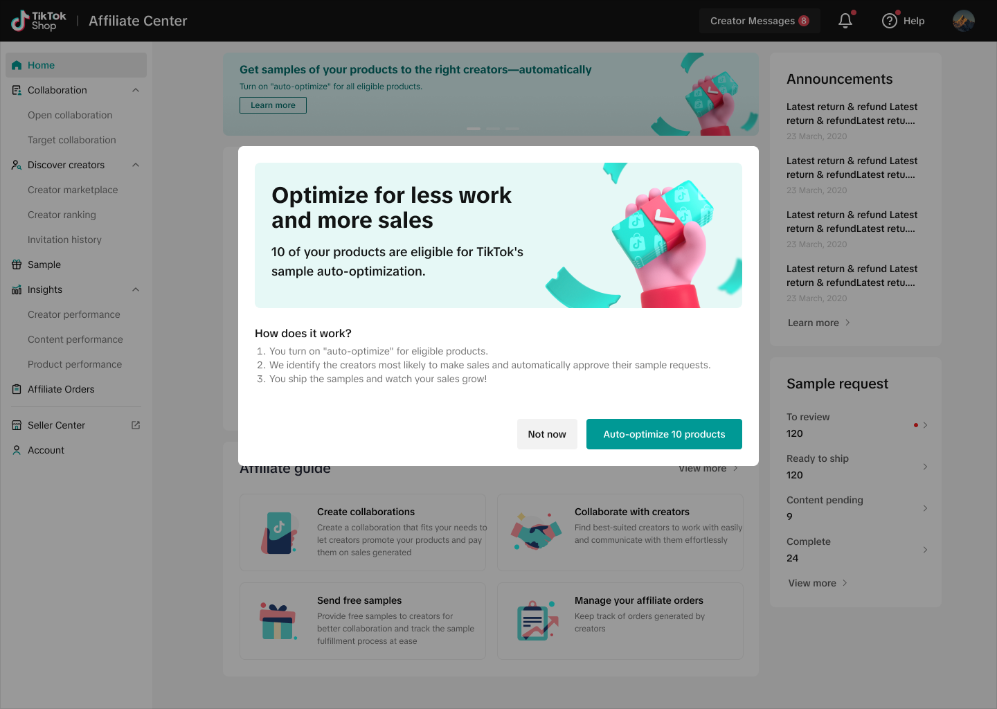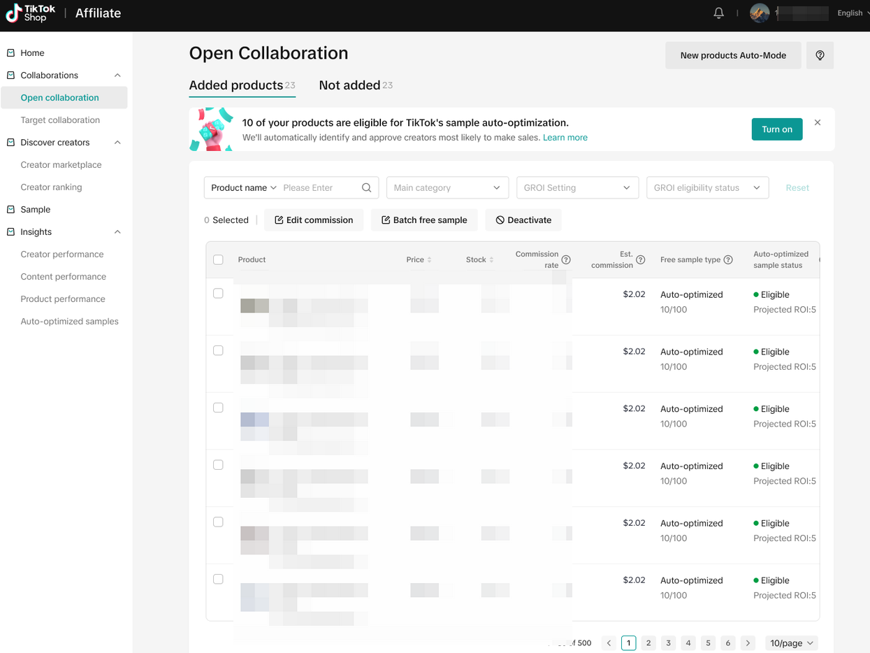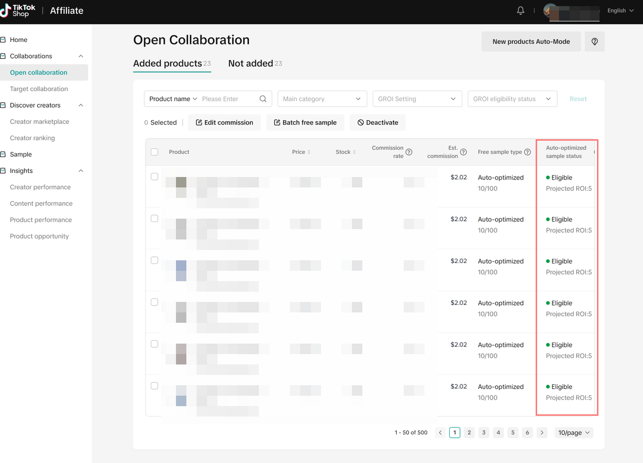 作为卖家,当你将符合条件的商品打开自动优化样品功能时,TikTok Shop将自动处理库存管理、达人匹配、样品请求审批,并提供最低目标订单量。你还可以调整已打开的商品的目标投资回报率(ROI),以通过降低ROI目标值来优化更多内容产出。