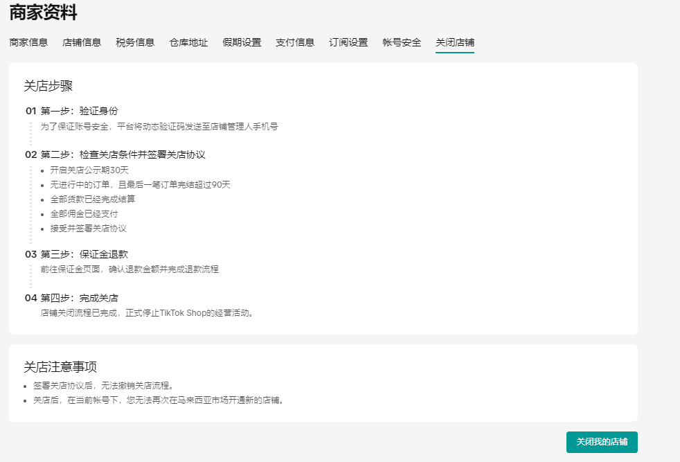 - 关闭店铺:如您有关闭店铺的需求,可根据图示步骤完成
