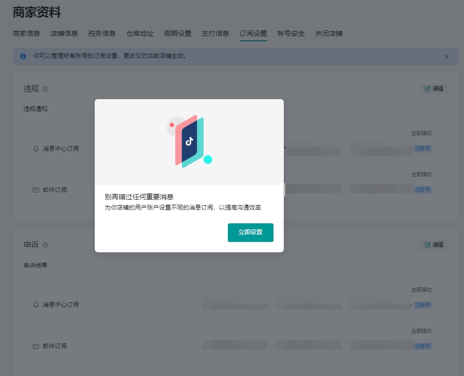 - 订阅设置:您可在此为您店铺的用户账号设置不同的消息类型,以提高沟通效率