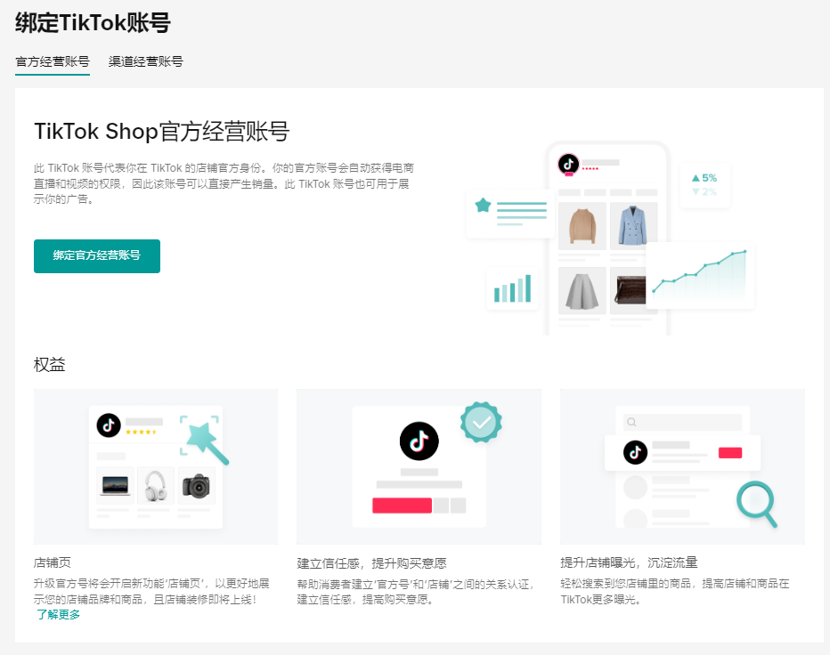 您可在此绑定官方经营账号及渠道经营账号。详见: