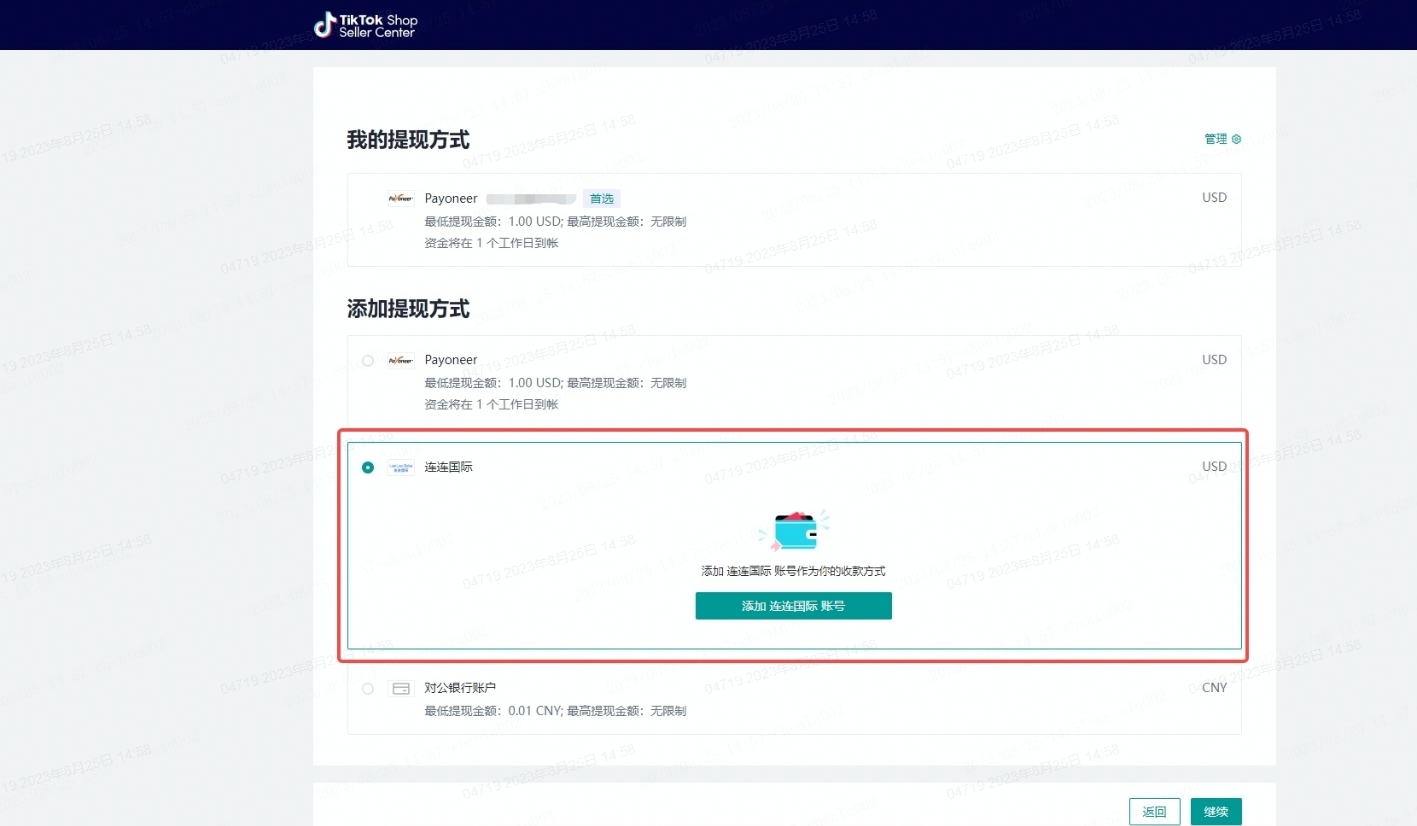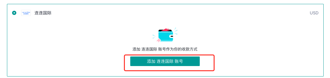使用连连国际账号提现,请先点击“添加连连国际账号”,如果已有连连国际账号可以直接登录,如果没有账号,请先完成注册,添加完成后可正常使用