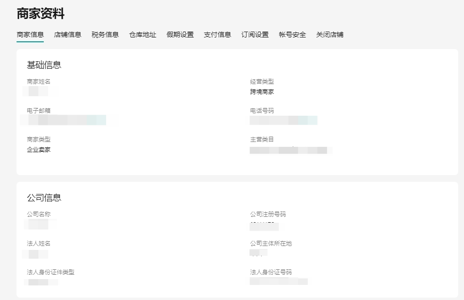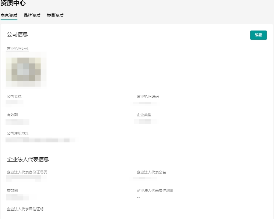 - 商家资质:主要指您的公司信息及企业法人代表信息。如您的商家资质信息有变更,可进行编辑。
