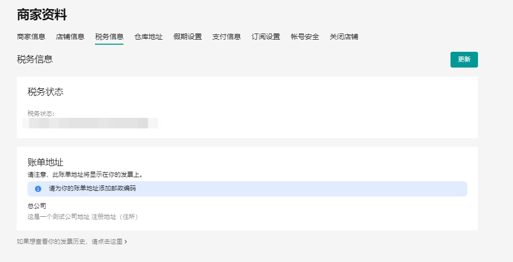 - 税务信息:包括税务状态、账单地址等信息;您也可在此界面查看您的发票历史