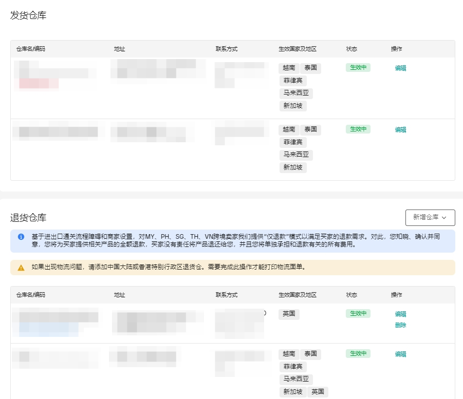 - 仓库地址:可设置发货仓库与退货仓库,仓库信息可编辑修改