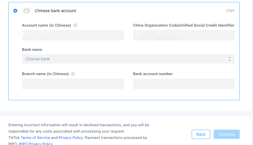 支付信息是您的结算账号信息,您可以在这里添加并更改您的账号,并查看您的结算账号状态。