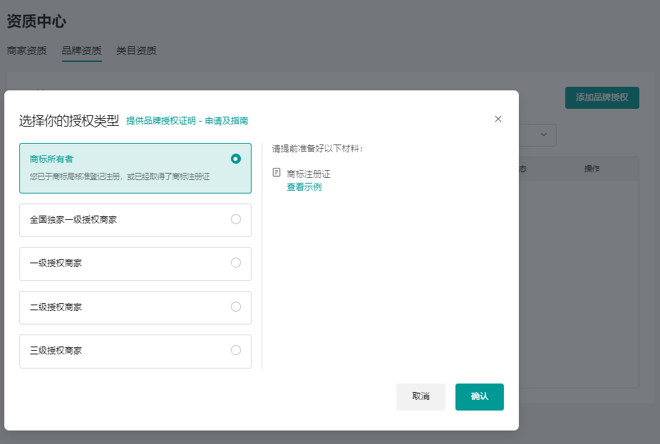 - 品牌资质:您可在此页面,为您的品牌添加品牌授权
