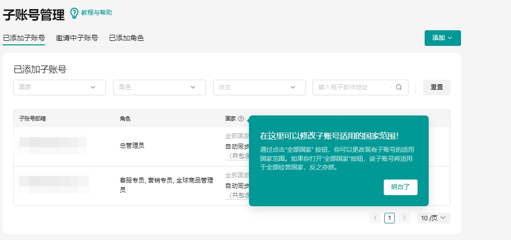 支持添加、移除、编辑子账号,并给不同子账号设置不同的角色权限