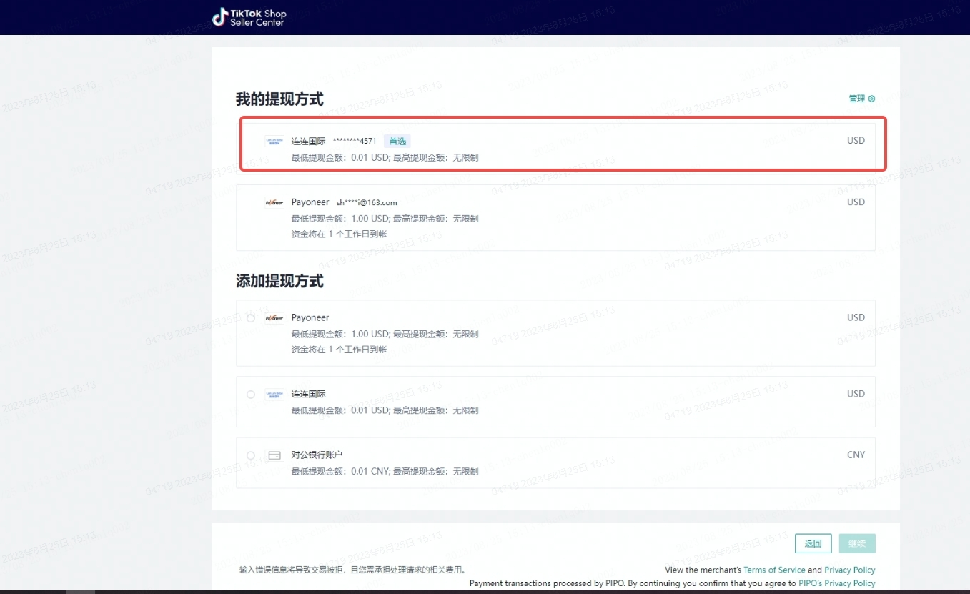 目前支持使用“Payoneer”账号,“连连国际”账号,“PingPong”账号和中国内地对公银行卡(对公银行卡目前仅支持跨境马泰越菲跨境商家)
