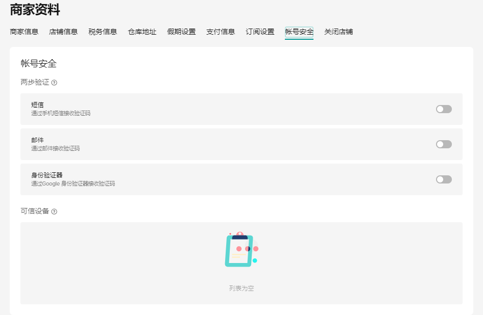 - 账号安全:您可为您的账号选择如下两步验证的方式,同时可以查看您的可信设备(在可信设备上,您可跳过两步验证)