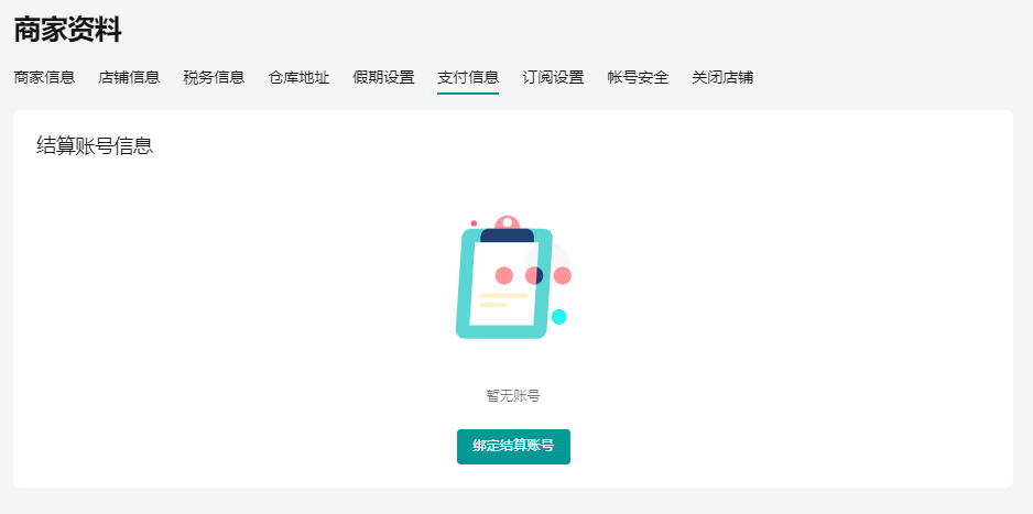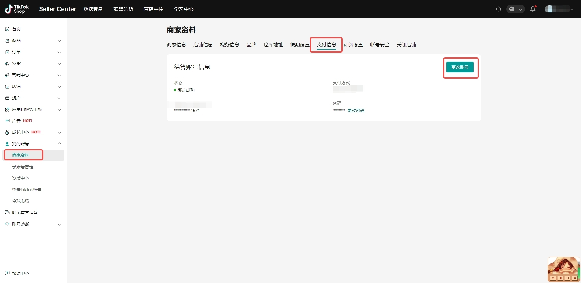 - 选择【我的账号】-【商家资料】-【支付信息】-【绑定结算账号】/【更改账号】