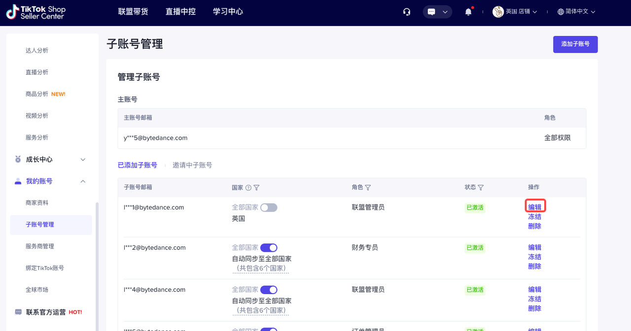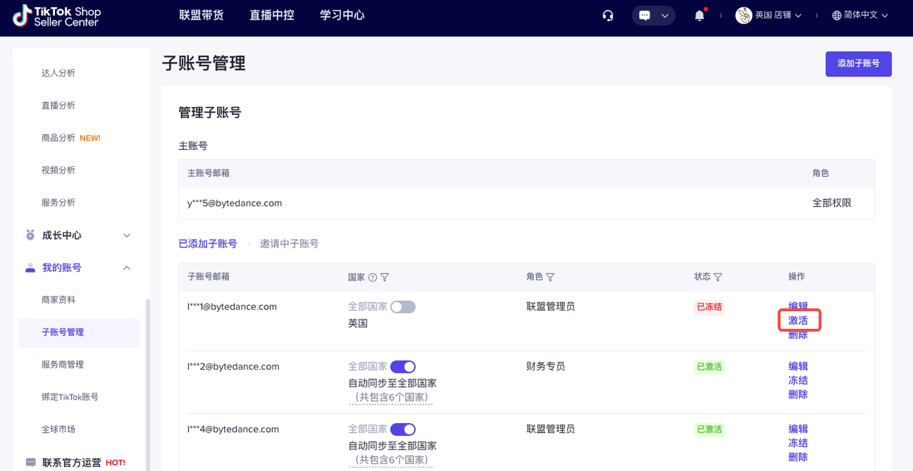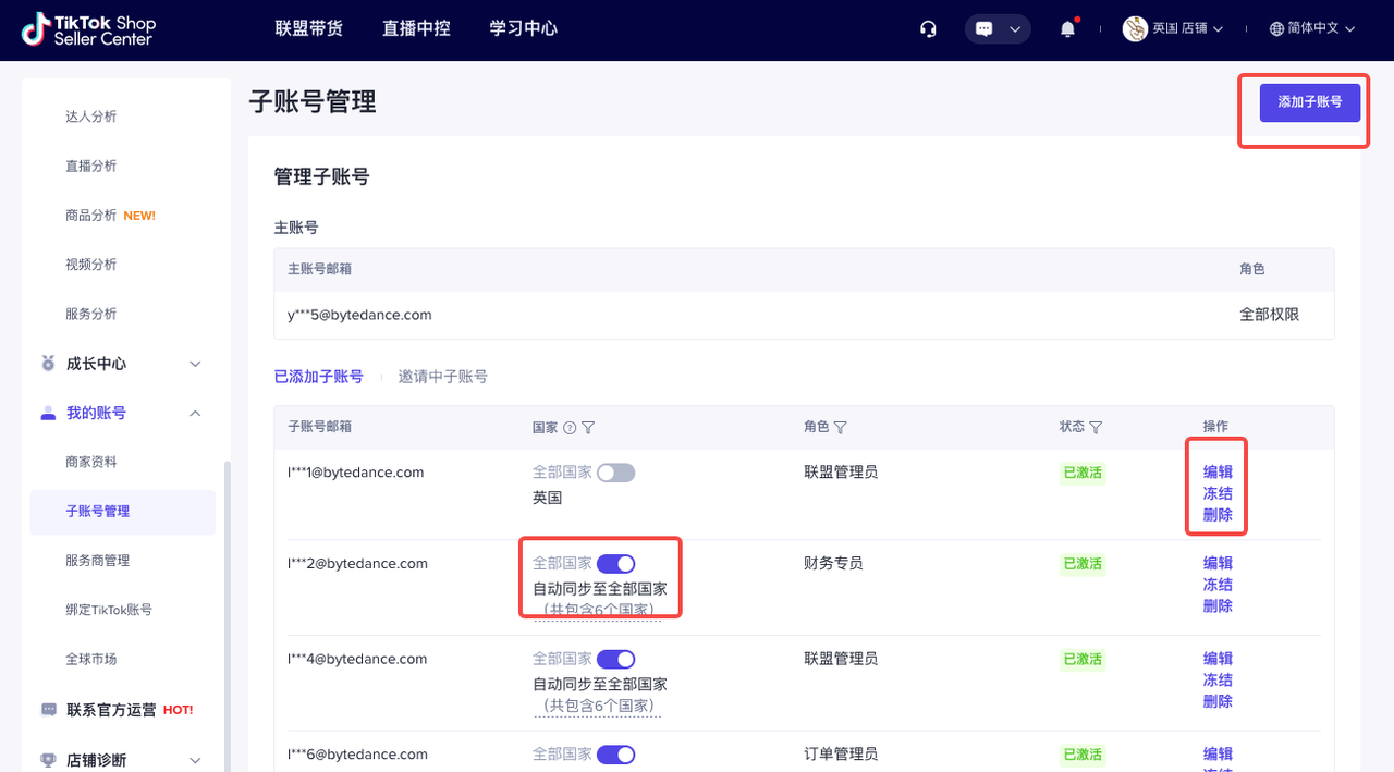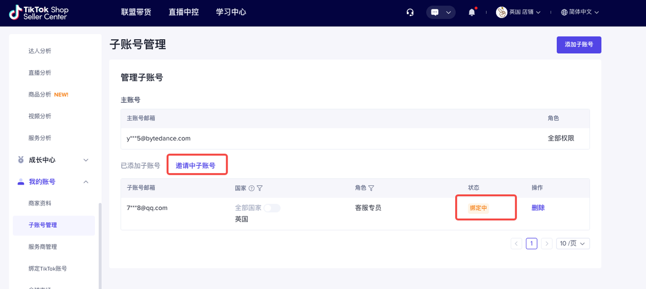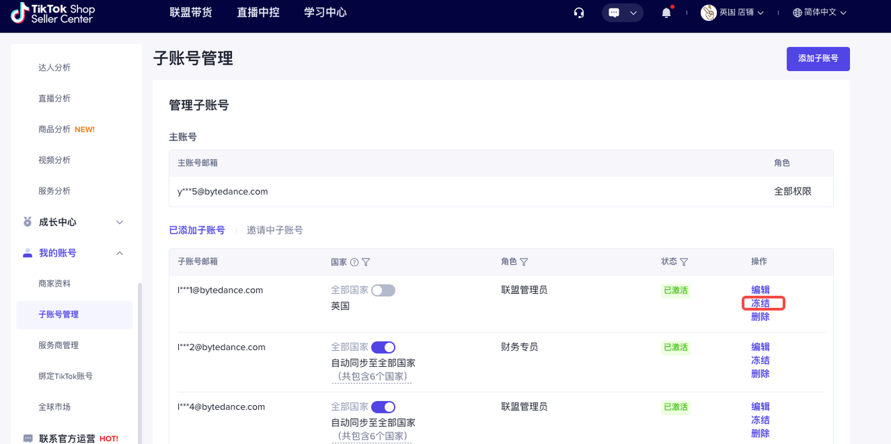主账号可以在【TikTok Shop商家后台】-【我的账号】-【子账号管理】可以进行客服专员角色的增加、修改、删除、冻结、激活等管理。