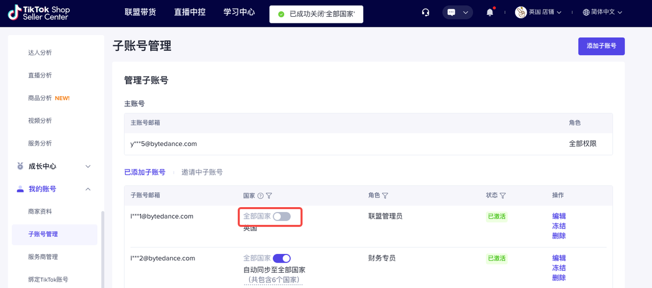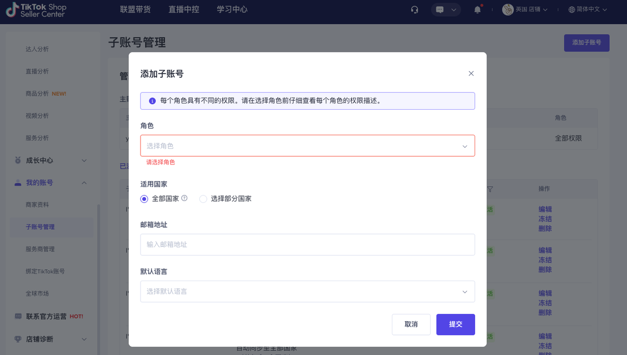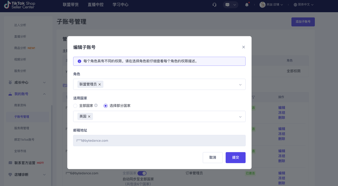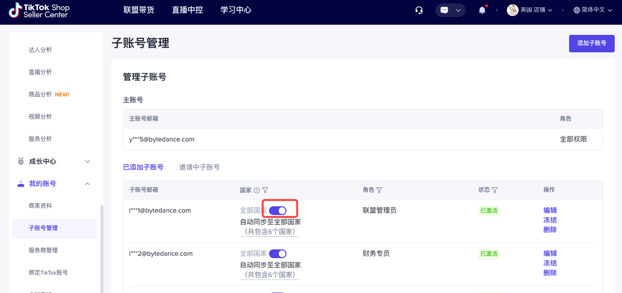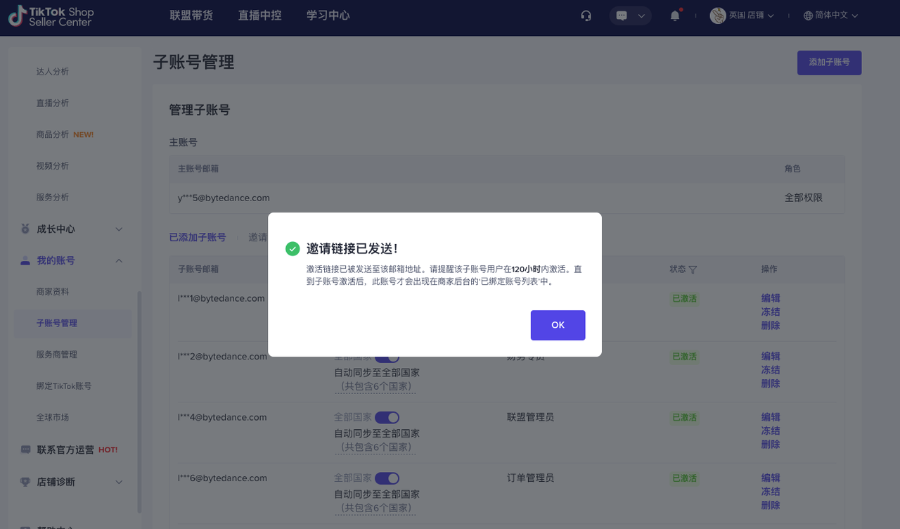 主账号可以在【TikTok Shop商家后台】-【我的账号】-【子账号管理】可以进行客服专员角色的增加、修改、删除、冻结、激活等管理。