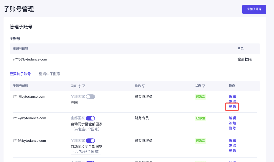 - 绑定中的子账号将会出现在【邀请中子账号】列表下。待确认激活后,此账号将会出现在【已添加子账号】列表下。
