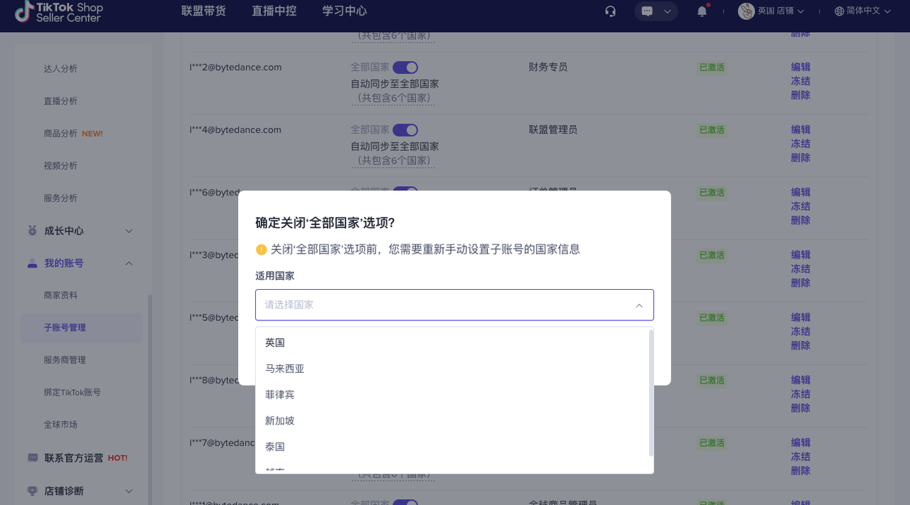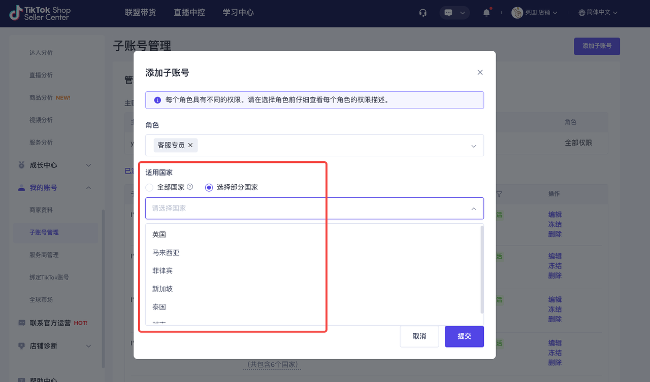 - 如果跨境商家在多国都有开店,则需选择此账号适用的国家。可选择全部国家或者部分国家。添加成功后,此账号将具有对应国家店铺的相应权限。