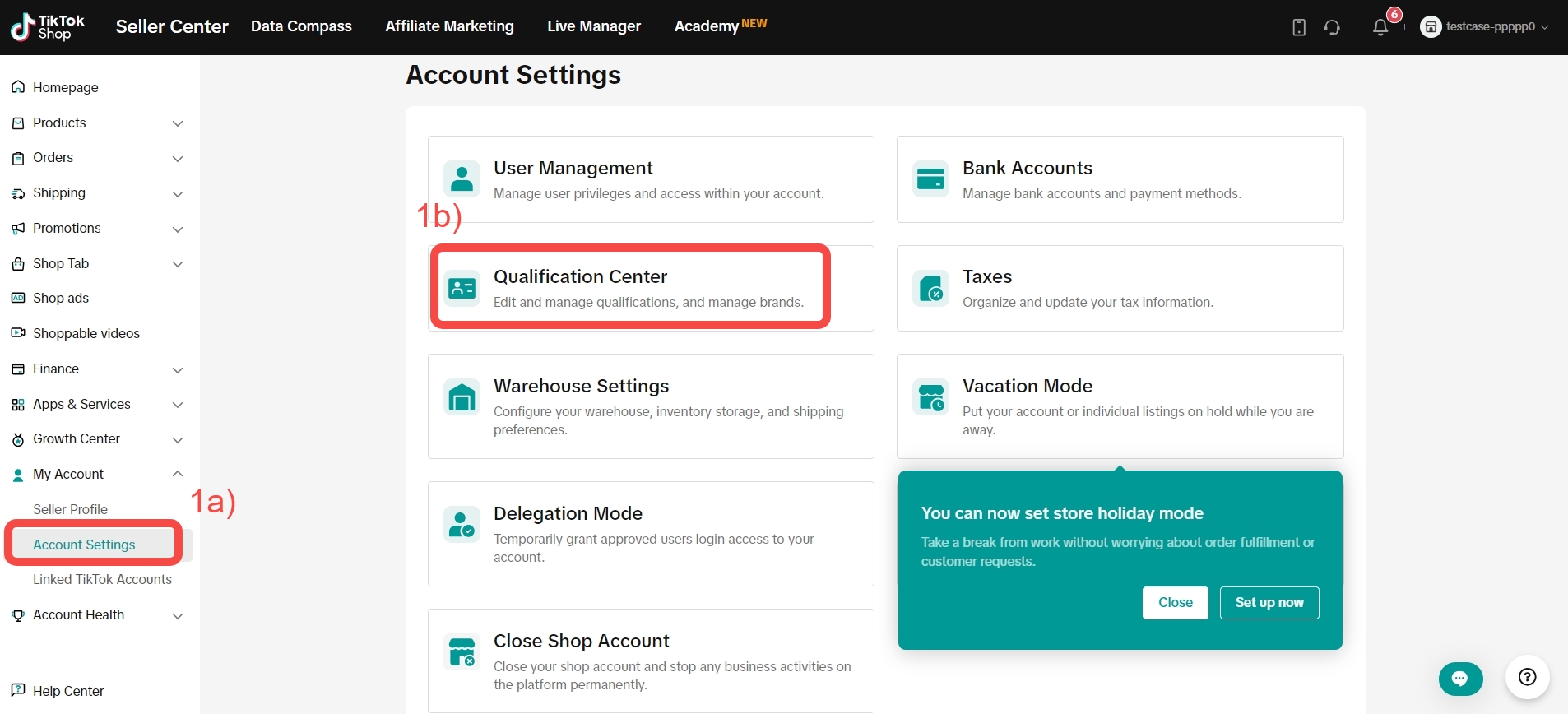 在电脑端访问“商家中心”,点击“我的账号” > “账号设置” > “资质中心”