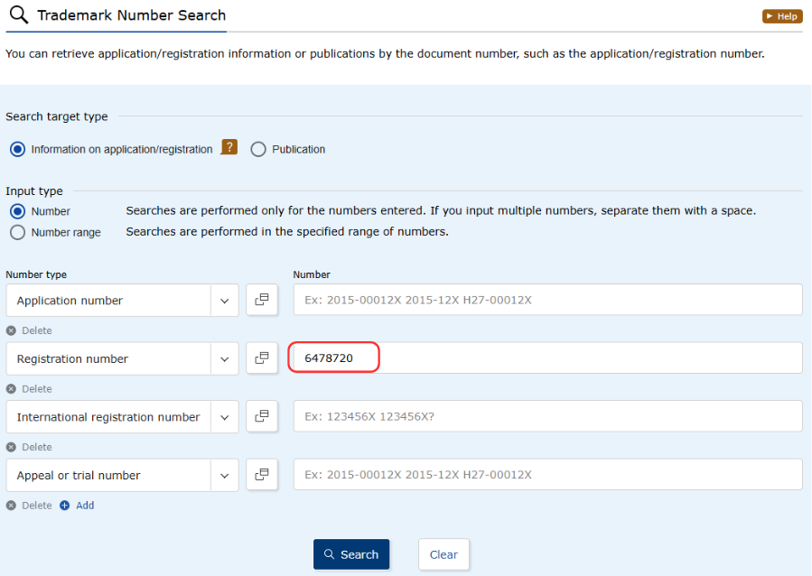 商标号必须与官方注册簿中的注册号完全一致,但不包含任何参考前缀,如T、P、U或D。