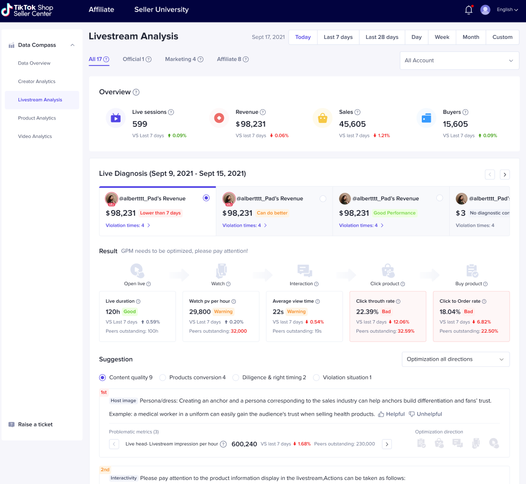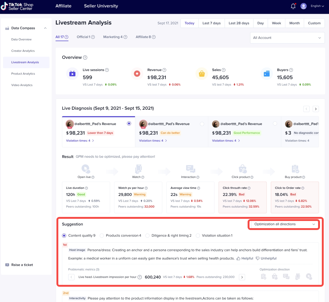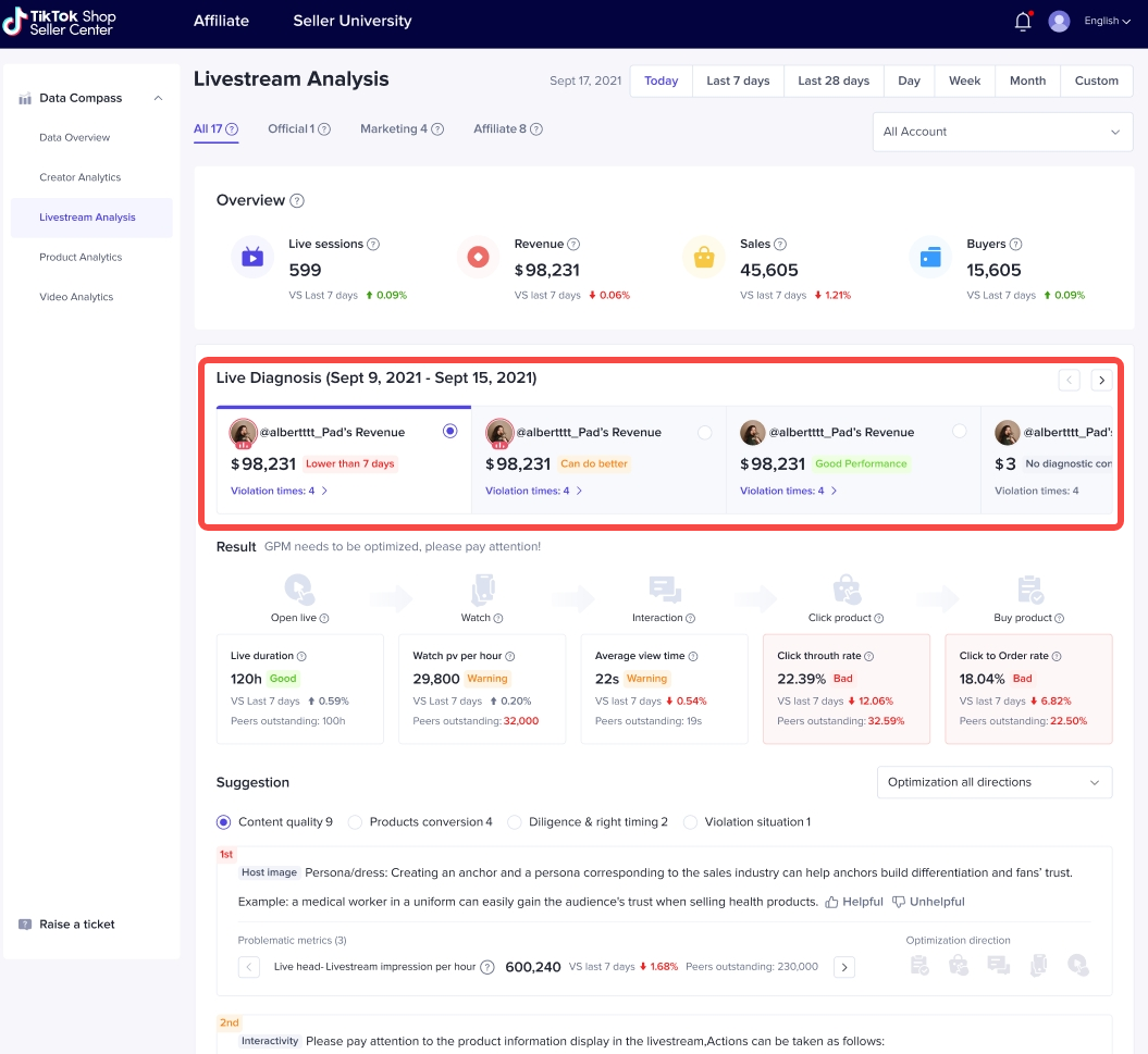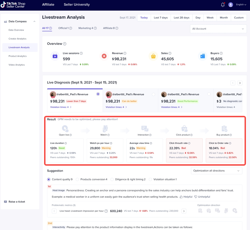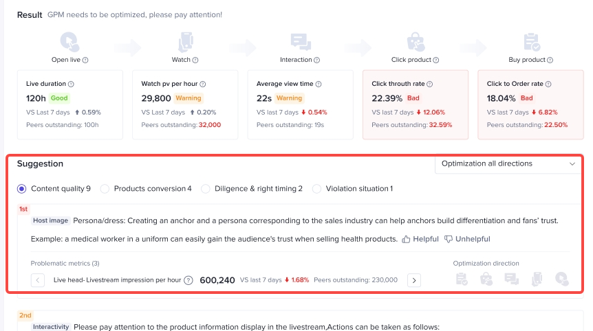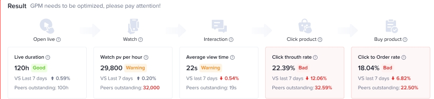 直播诊断可以直接给出诊断结果,告诉商家哪些环节做的还不够好:【Bad】是目前我们做的不好的环节;【Warning】是表现所有下降,需要引起我们注意的环节;【Good】是当前做的较好的环节。