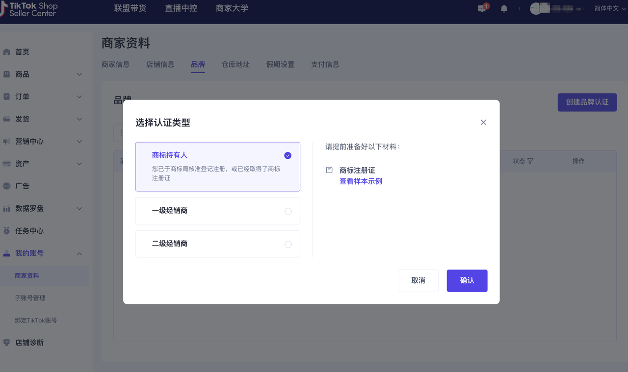 - 步骤一:进入【商家中心】,点击【我的账号】>>【商家资料】,切换到【品牌】页面,点击右侧【创建品牌认证】进入创建页面。