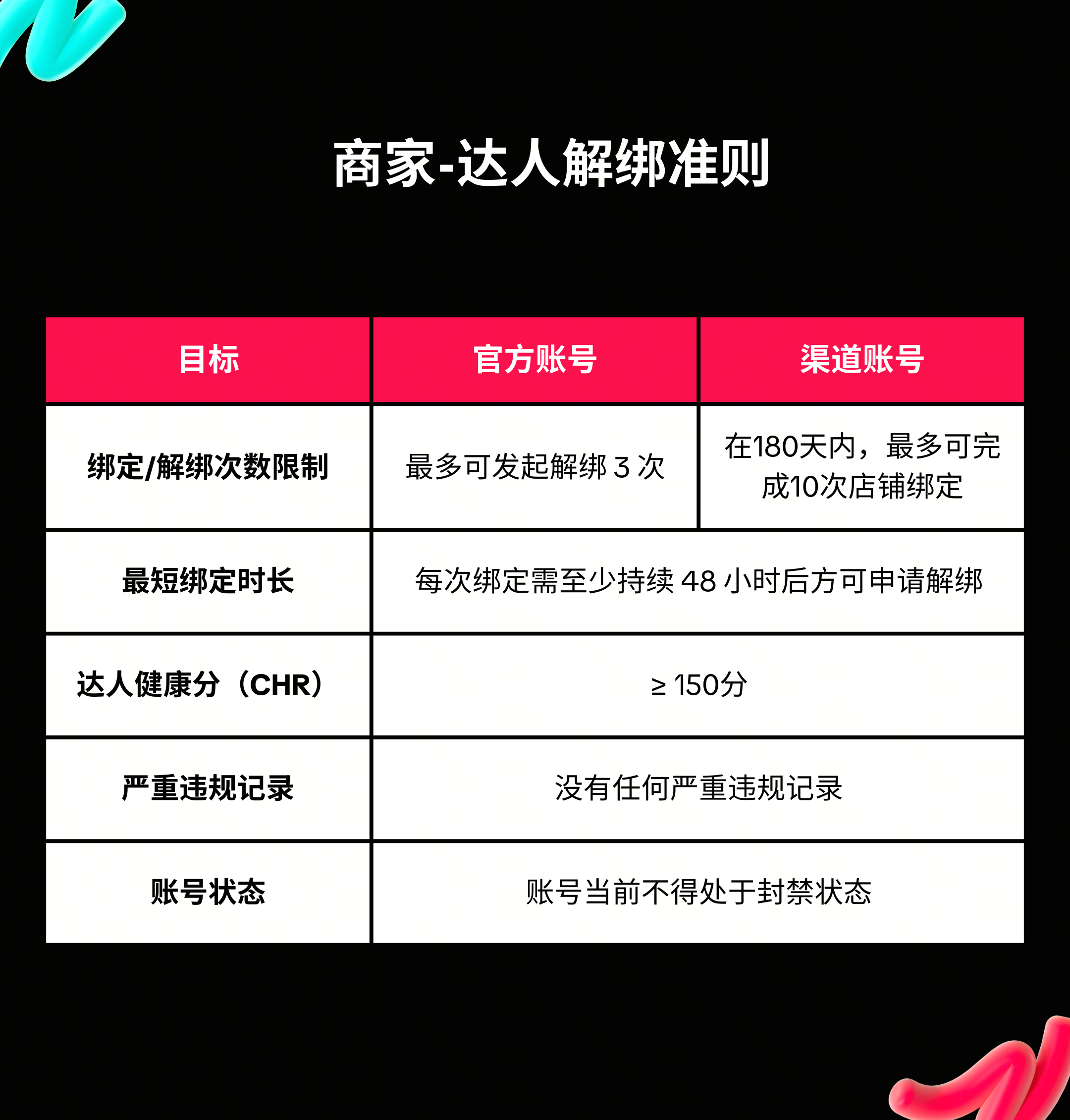 这些准则用于判断 TikTok Shop 官方账号或渠道账号是否可以与店铺账号解绑。如果未满足对应准则,解绑操作将被暂时限制。