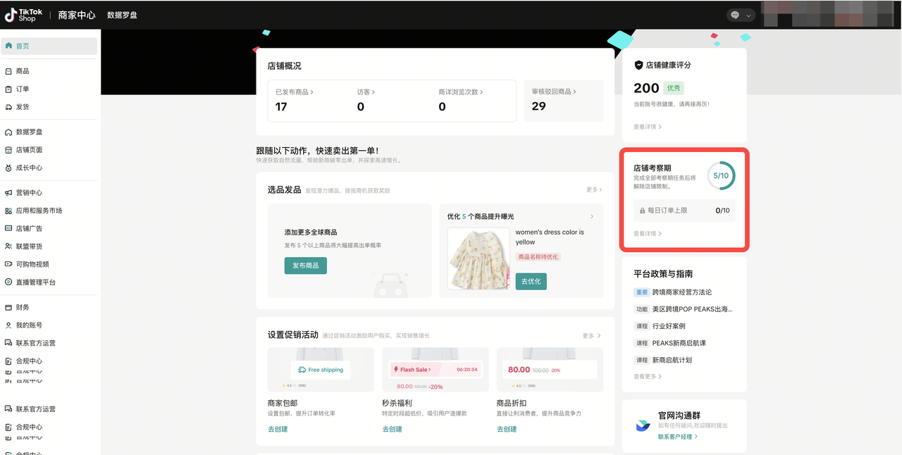 - 作为 TikTok Shop 标准成长适应流程的一部分,所有新入驻店铺均会进入店铺考察期。此举旨在保障买家信任,同时为商家留出充足时间,建立扎实的运营历程。