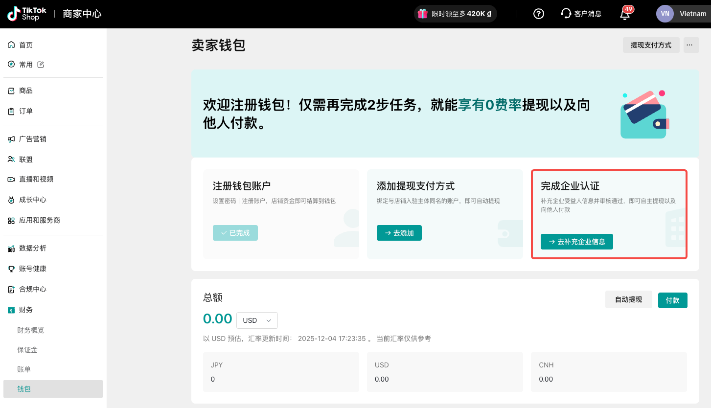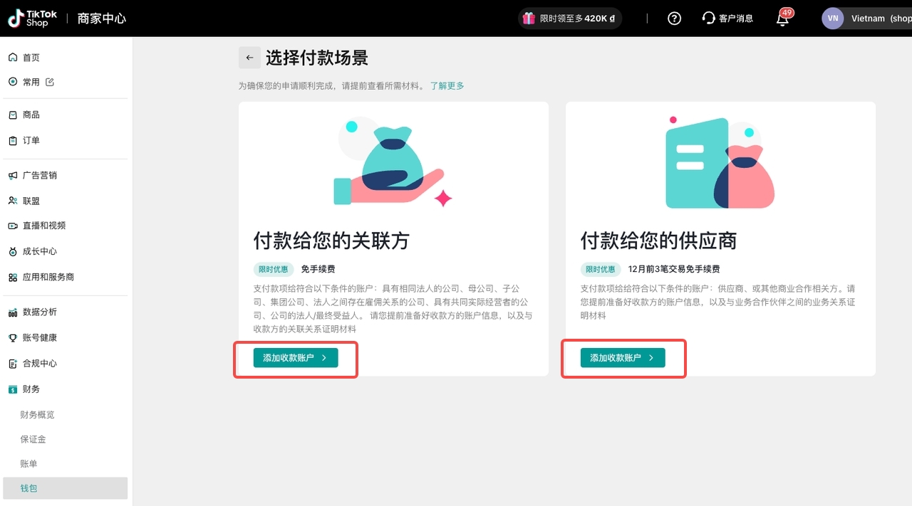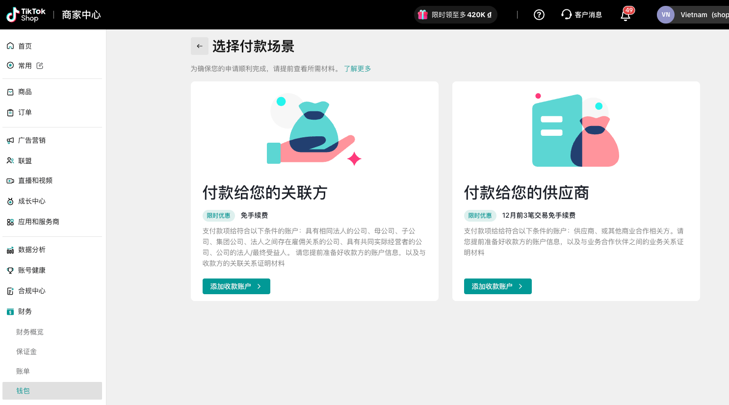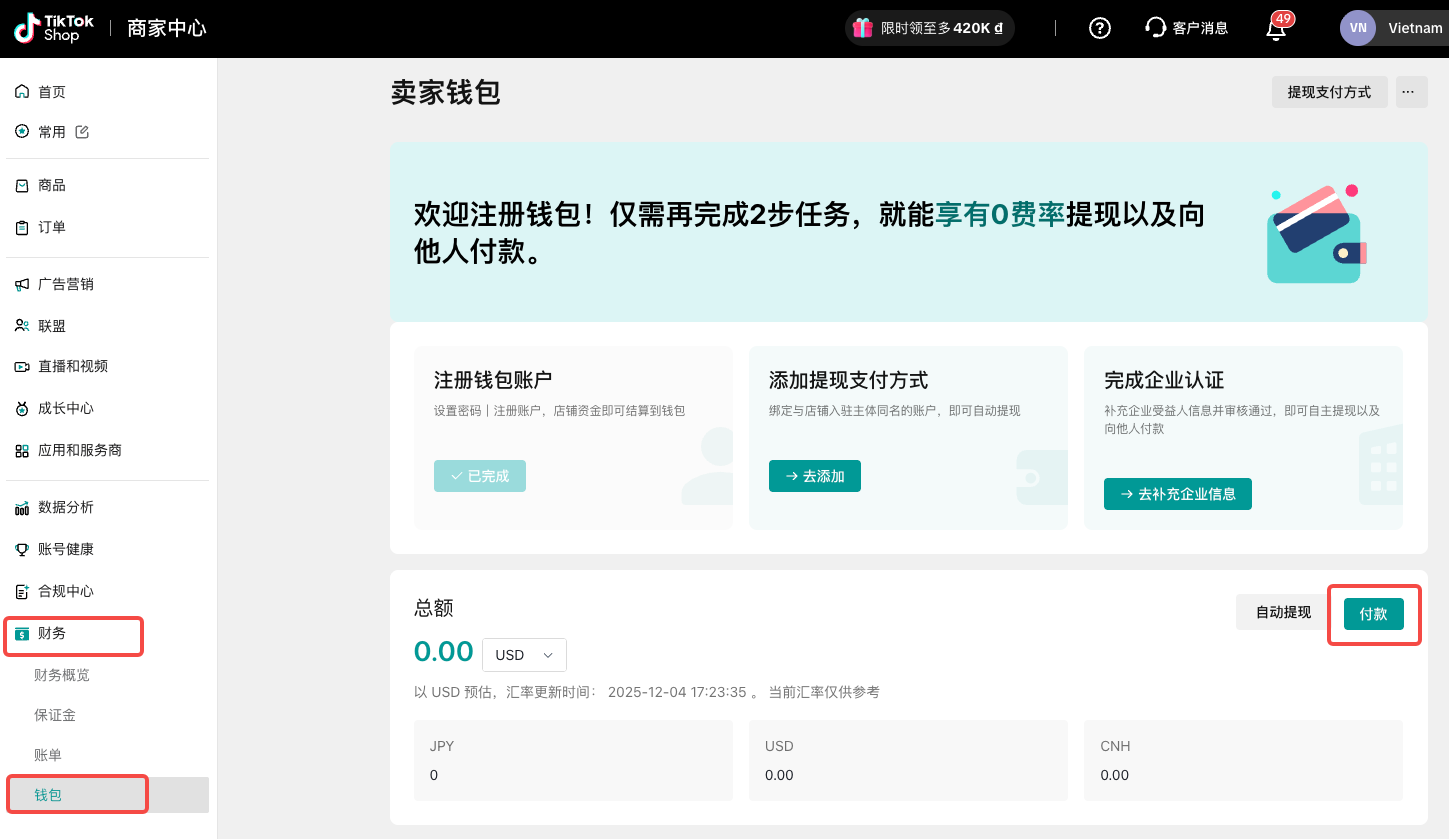 TikTok Shop商家中心功能入口:财务–钱包–付款