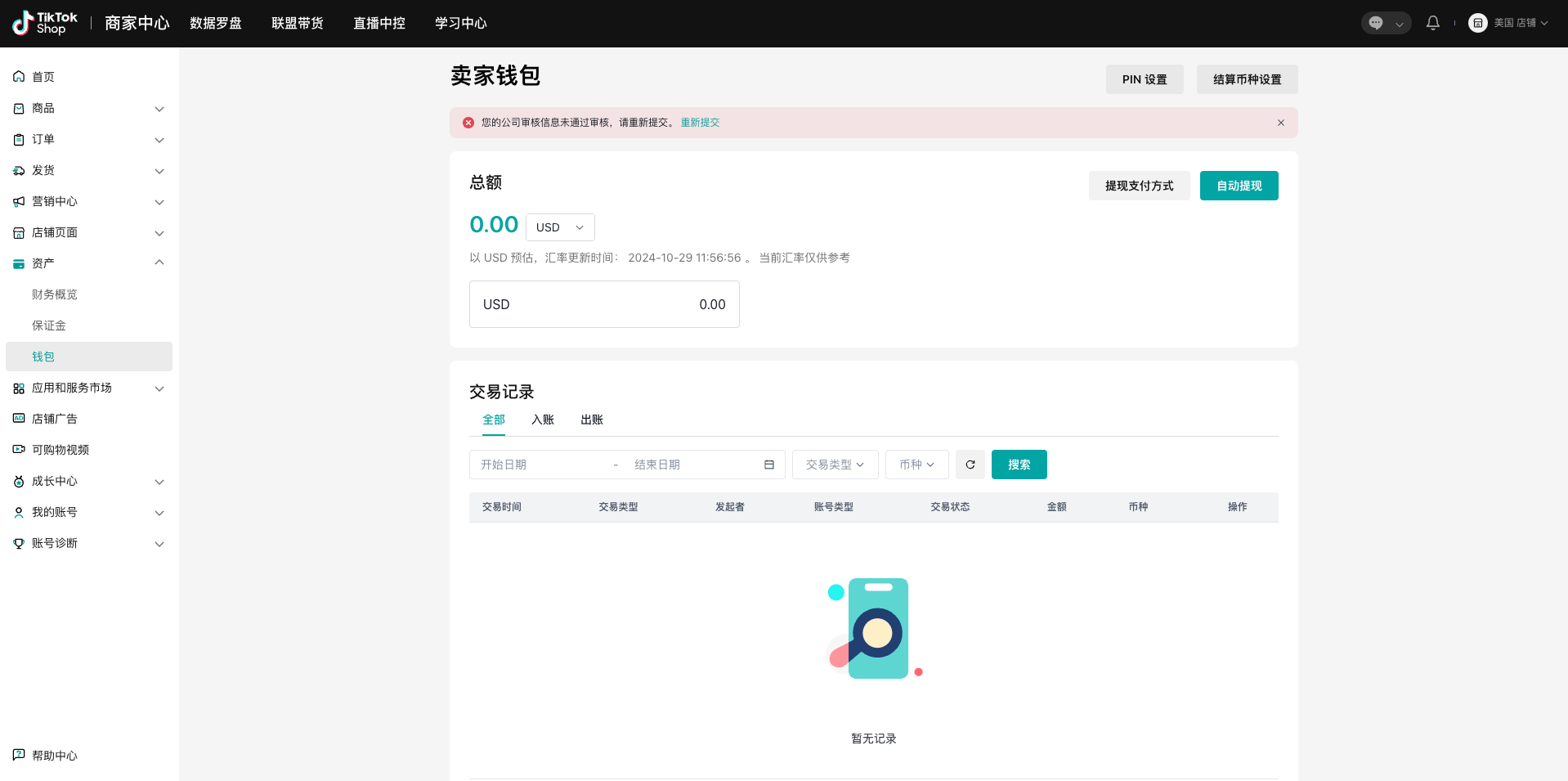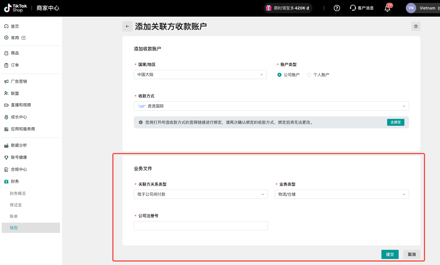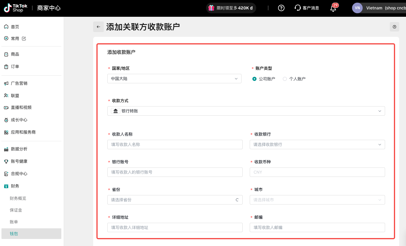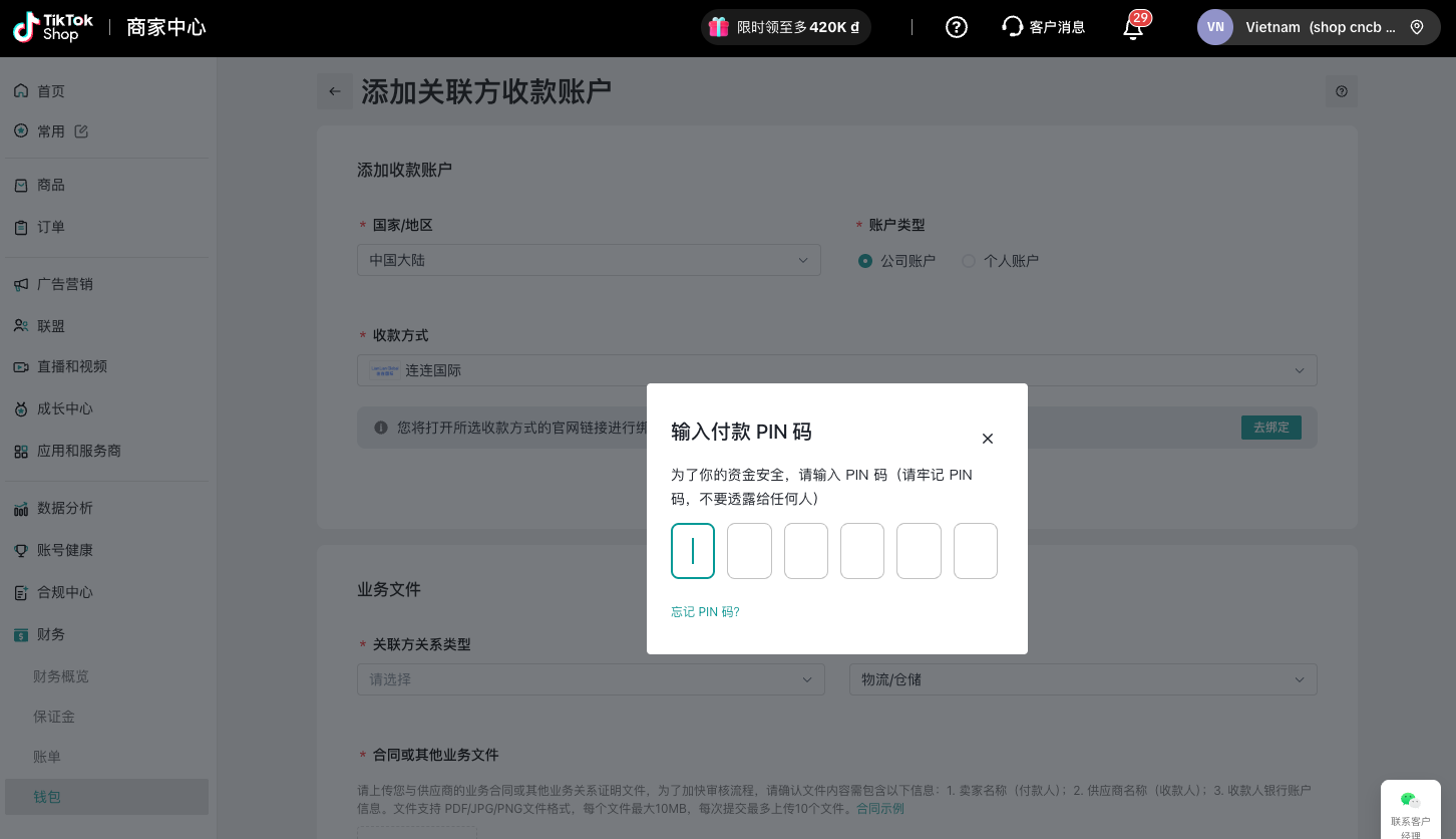 TikTok Shop商家中心功能入口:财务–钱包–付款