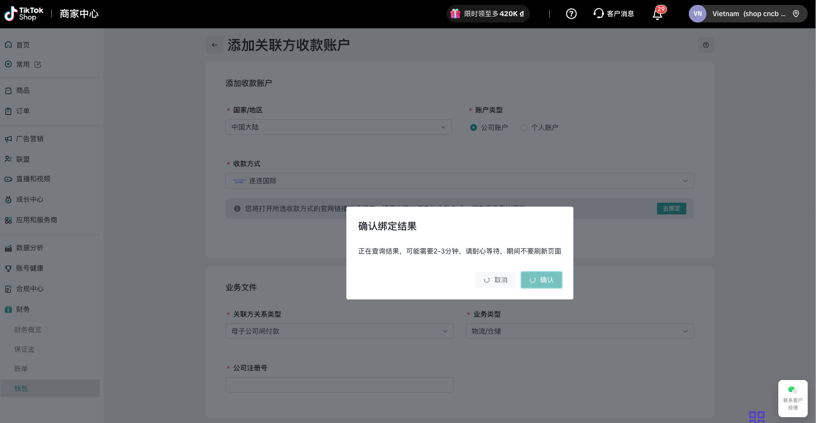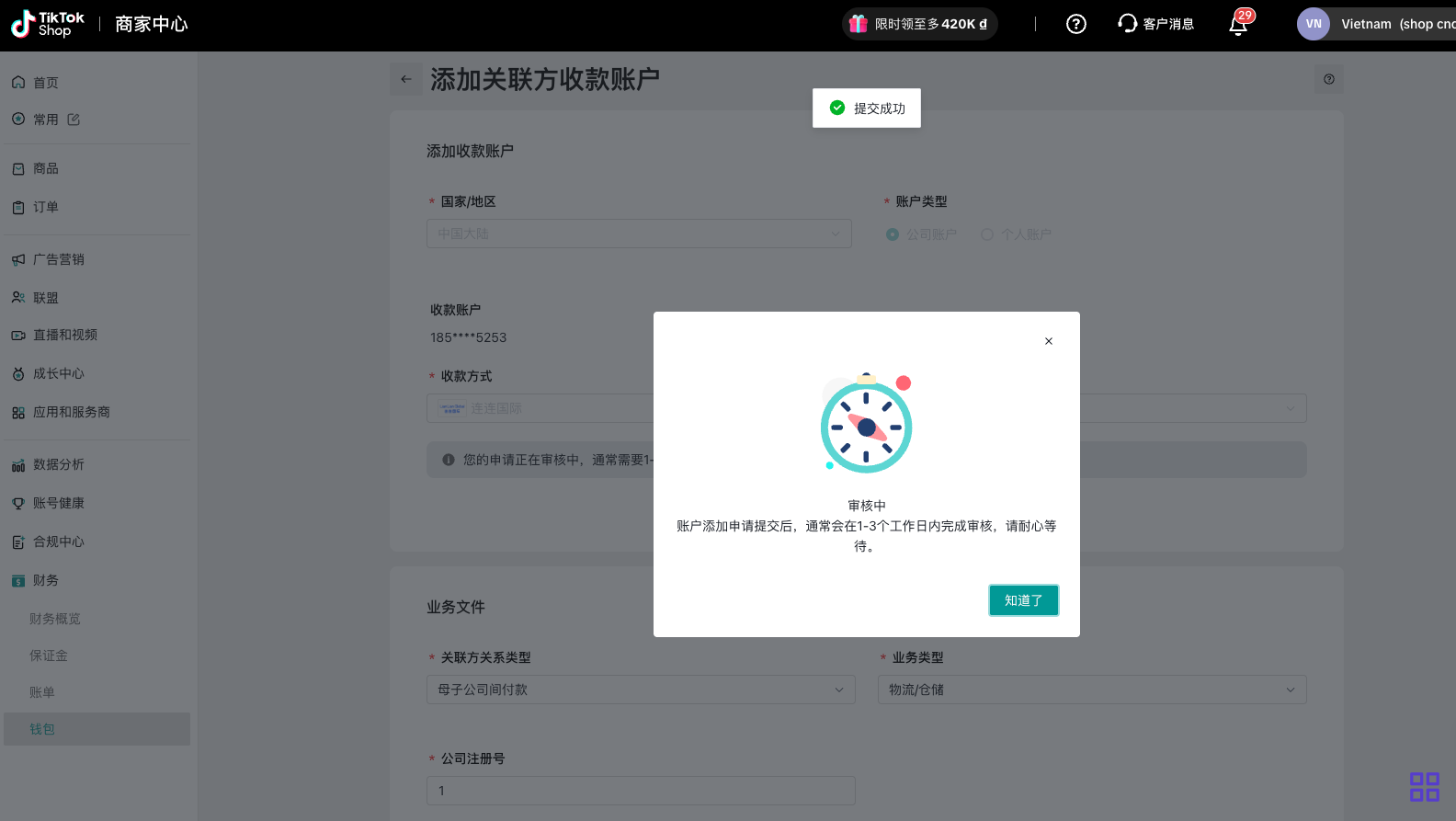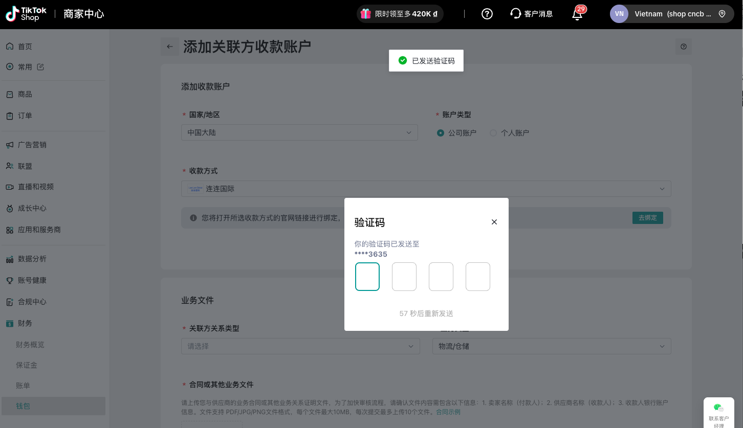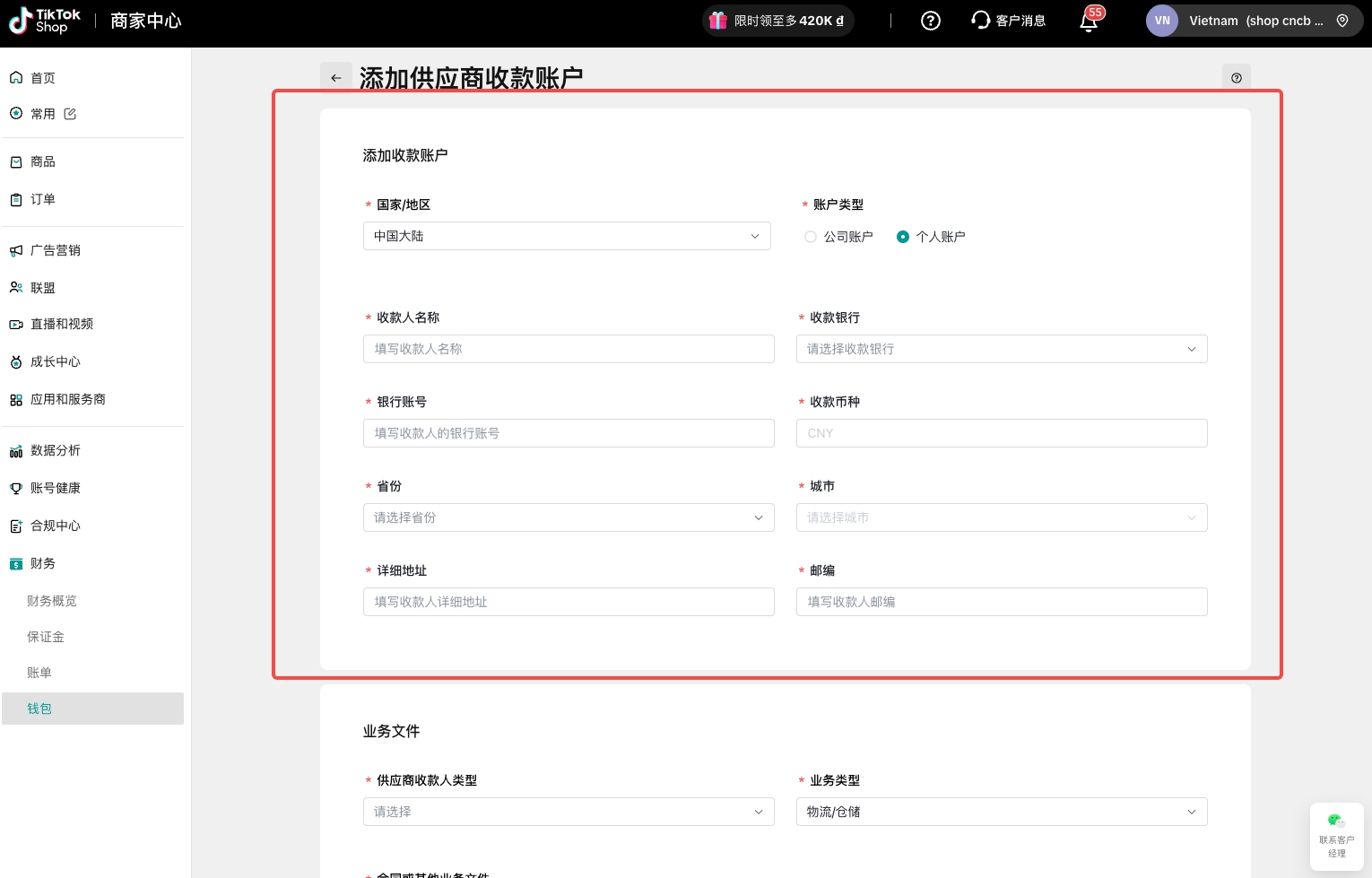TikTok Shop商家中心功能入口:财务–钱包–付款