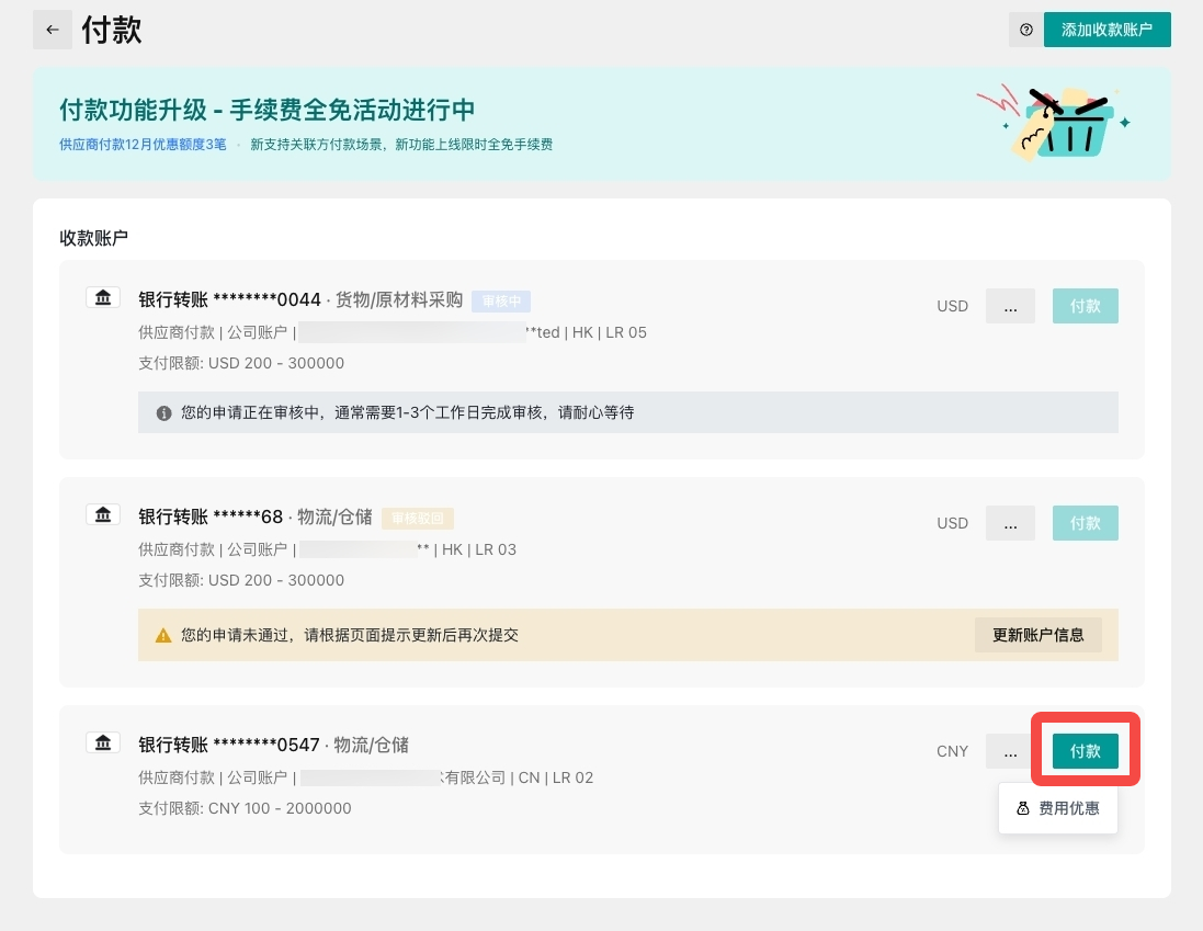当您添加的收款账户审核通过,页面对应账户的【付款】按钮将变成可点击状态,点击后进入付款页面。